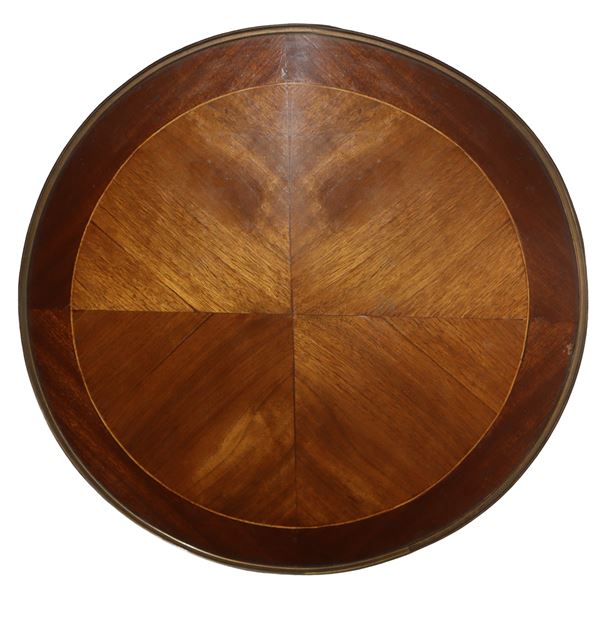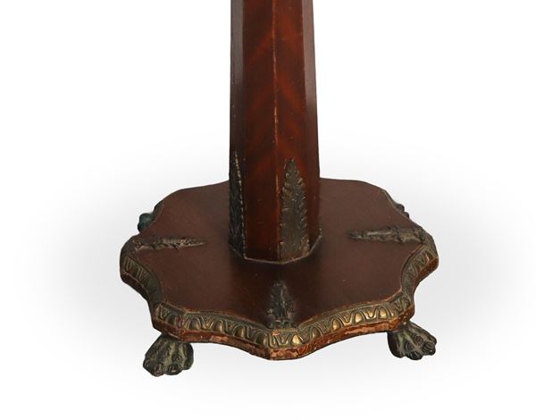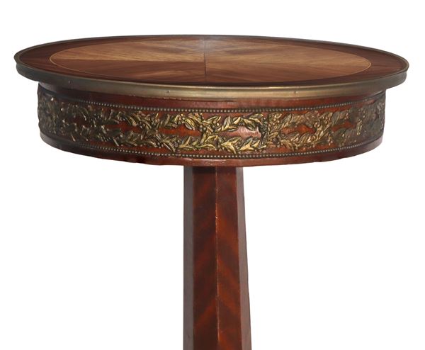 With hexagonal column support, round top in mahogany wood threaded at the edges and in light walnut in the centre, festoon bronzes applied to the underside along the entire circumference and to the base