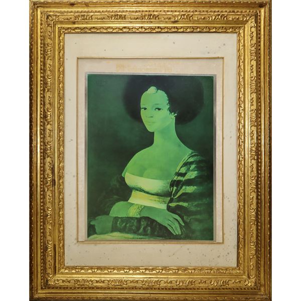 Signature and date on the front top left, second signature bottom right. Title "Gioconda africana, homage to Africa" and author on the back bottom. In an antique gilded wooden frame.