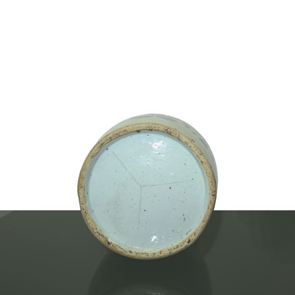 Chinese vase in celadon porcelain with blue decorations on a white background