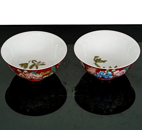 Pair of Famille Rose bowls in red enamel with decorative Peony motifs, Qing Dynasty