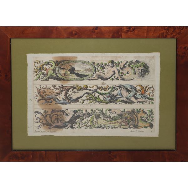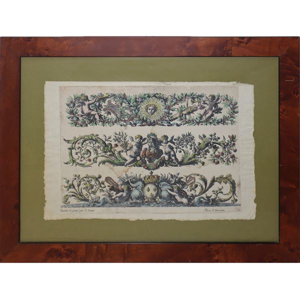 Pair of engravings depicting festoons with Putti, Flowers, Dolphins