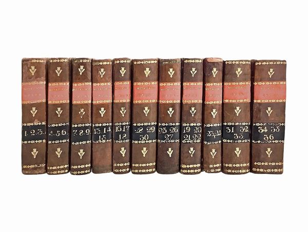 Series containing volumes: I, II, III, IV, V, VI, VII, VIII, IX, XIII, XIV, XV, XVI, XVII, XVIII, XIX, XX, XXI, XXII, XXIII, XIV, XXV, XXVI, XXVII, XXVIII, XXIX, XXX, XXXI, XXXII, XXXIII, XXXIV, XXXV, XXXVI. Venice, 1827 by the types of Giuseppe Antonelli Bookseller-Chalcographer