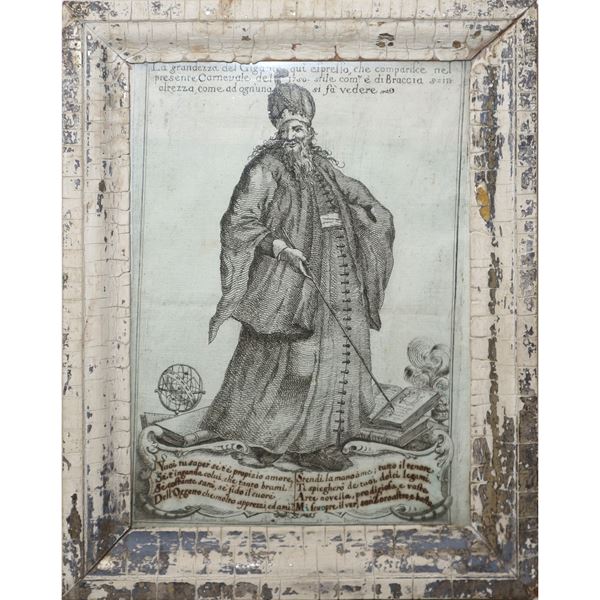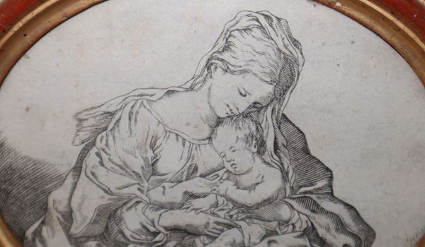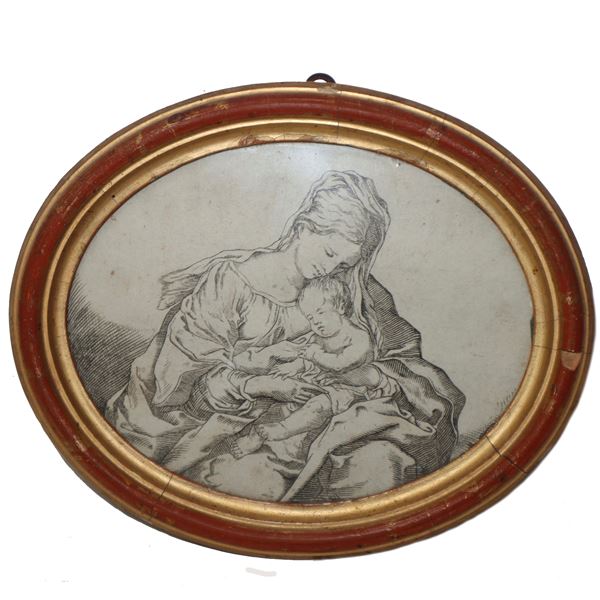 N°2 engravings, The greatness of the giant who appeared in the carnival of 1750 and oval Madonna with child, 18th century