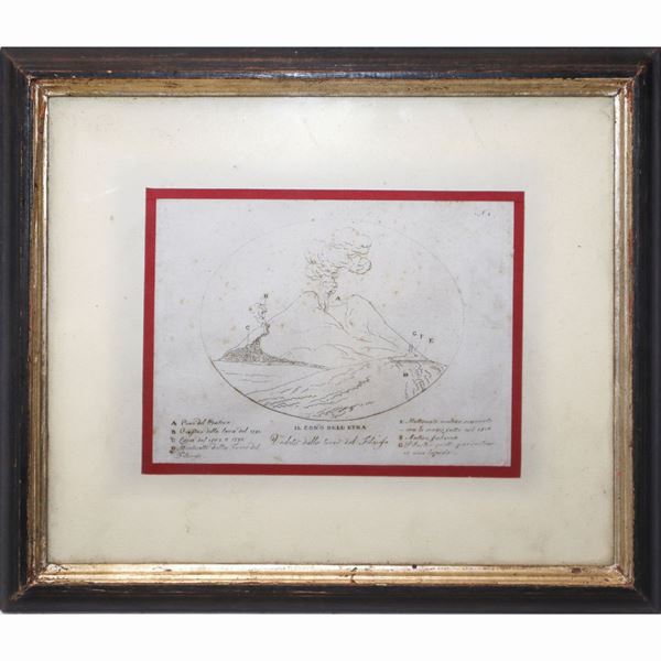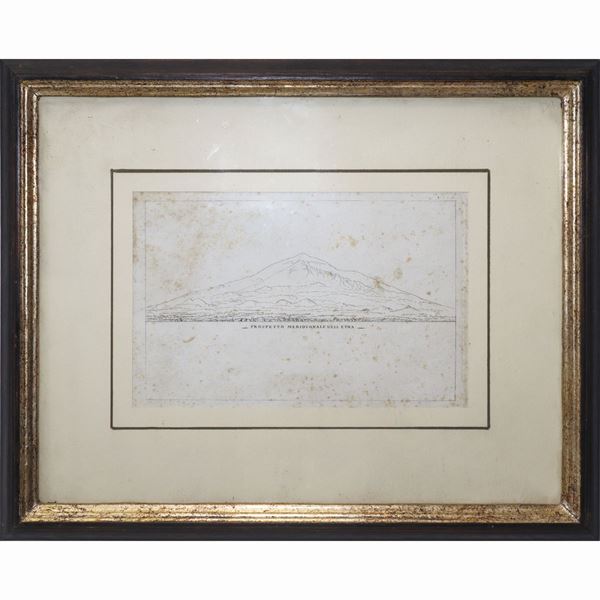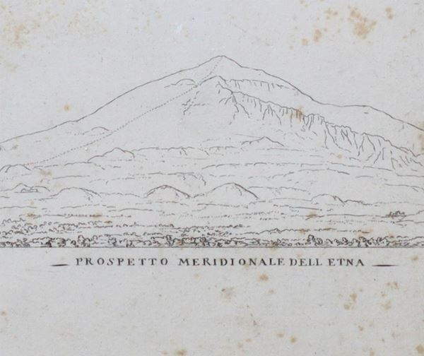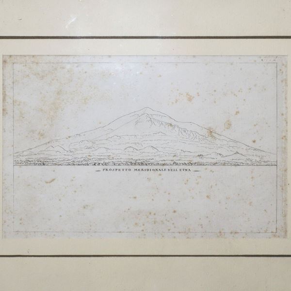 Pair of engravings depicting the cone of the volcano and the southern facade, 20th century