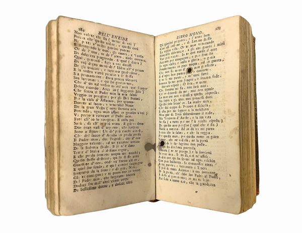 Edition by the Borsi brothers of Parma. Work translated and commented by the commendatore Annibal Caro between 1531 and 1544 together with the author's life and the Bucolics and Georgics. Present 14 illustrations outside the text.