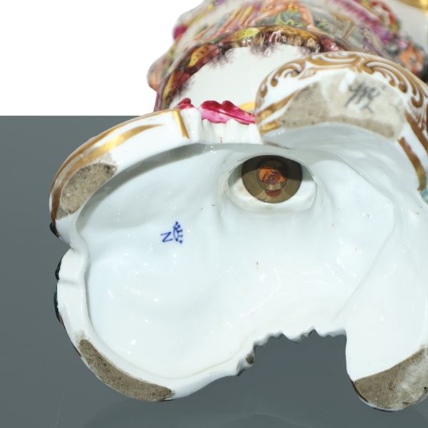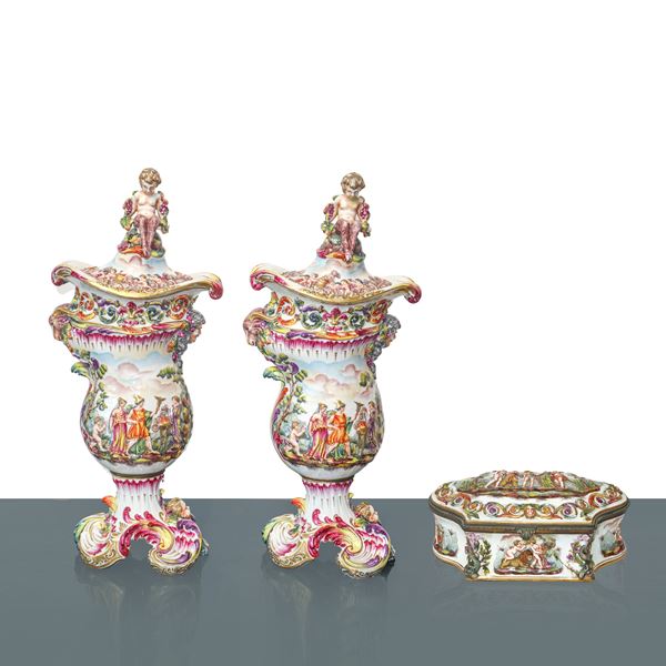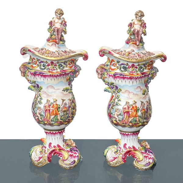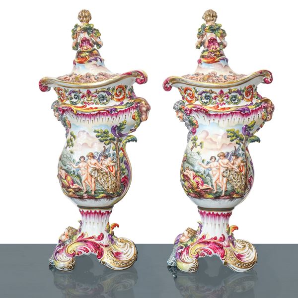 Pair of poutiche decorated in relief with cherubs on the top and a chest, inizi XX secolo