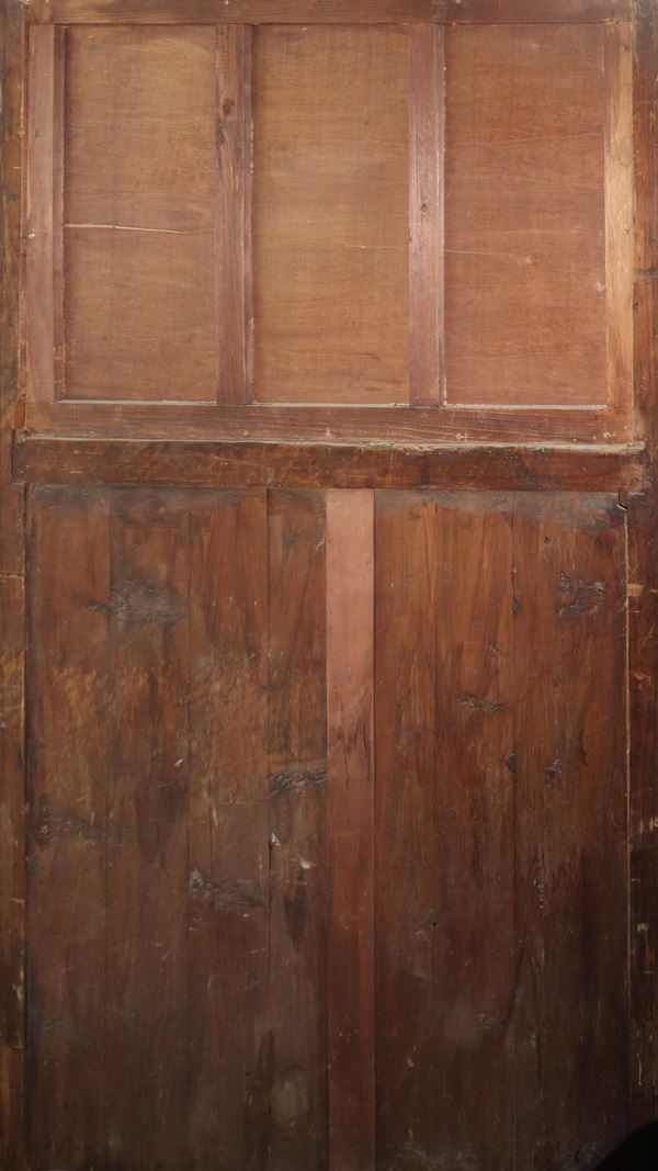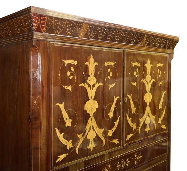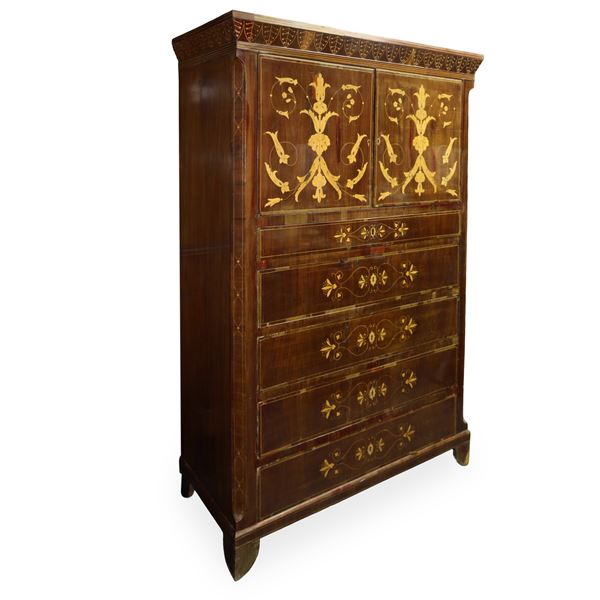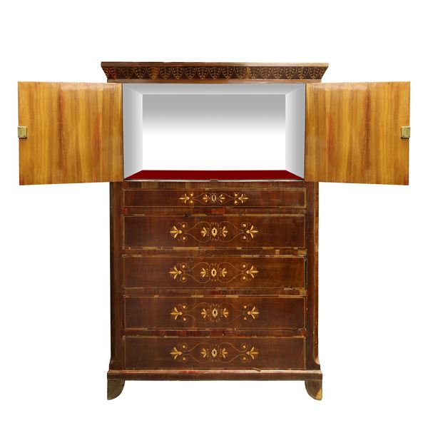 Chiffonier in mahogany and mahogany feather with contrasting light wood inlays, two upper doors, 5 lower drawers, Sicily 19th century
