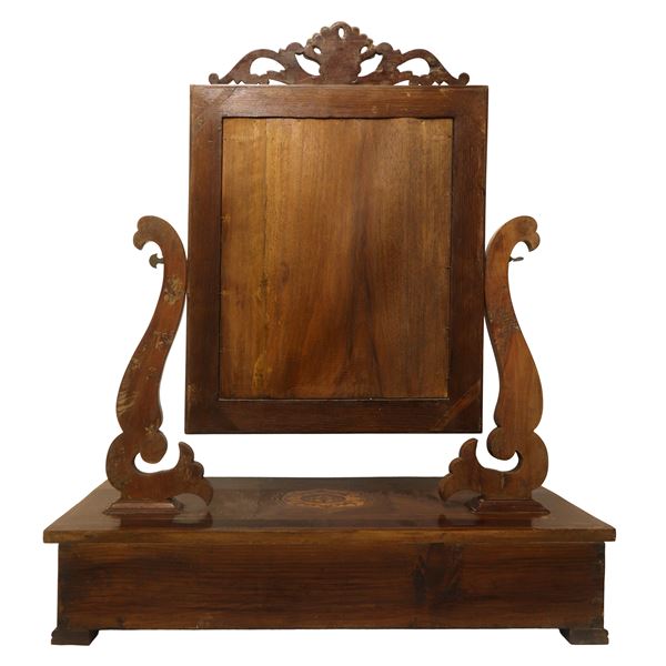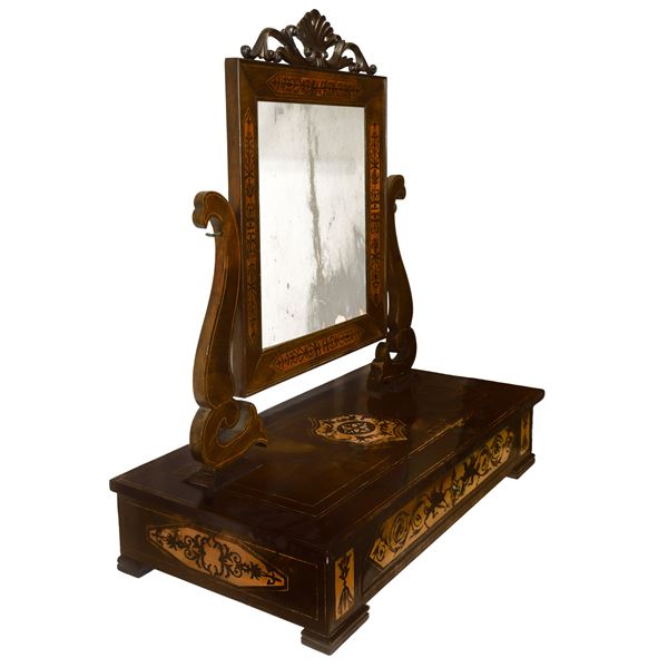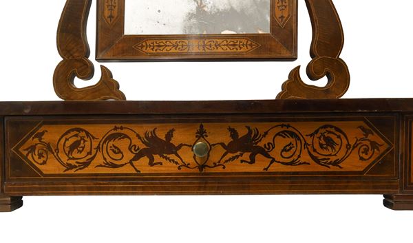 Dressing table in wood and walnut root and rosewood with rosewood inlays and drawer at the base
