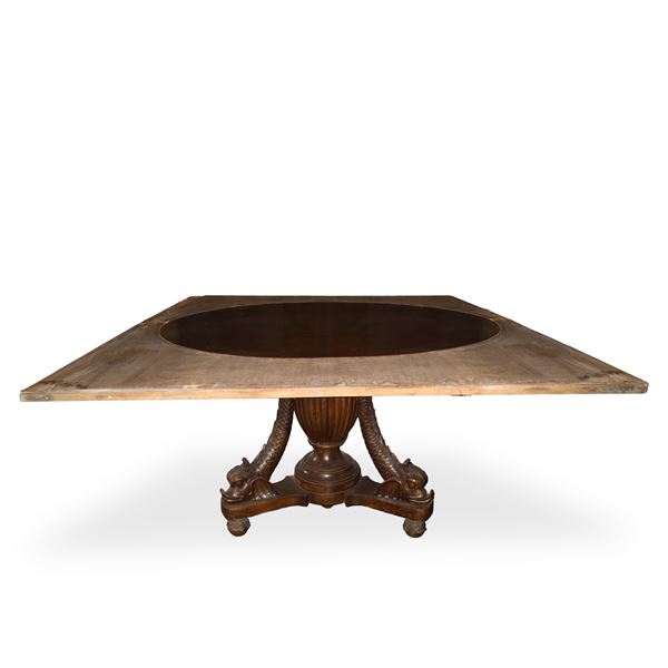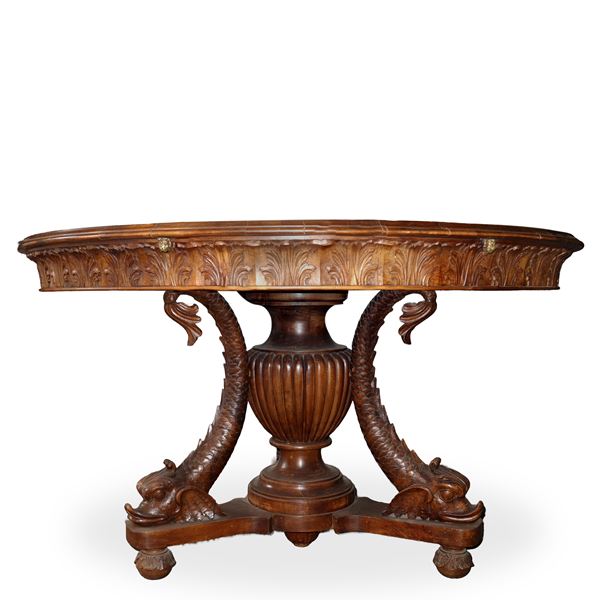 Extendable table with triple sculpture support, top with sculpted frill, 19th century
