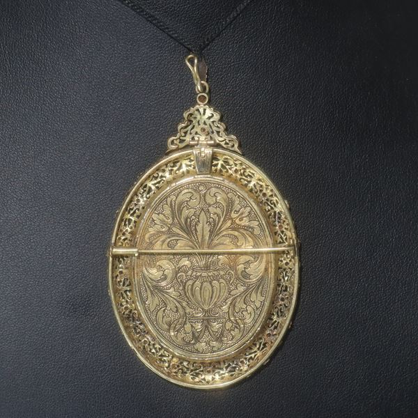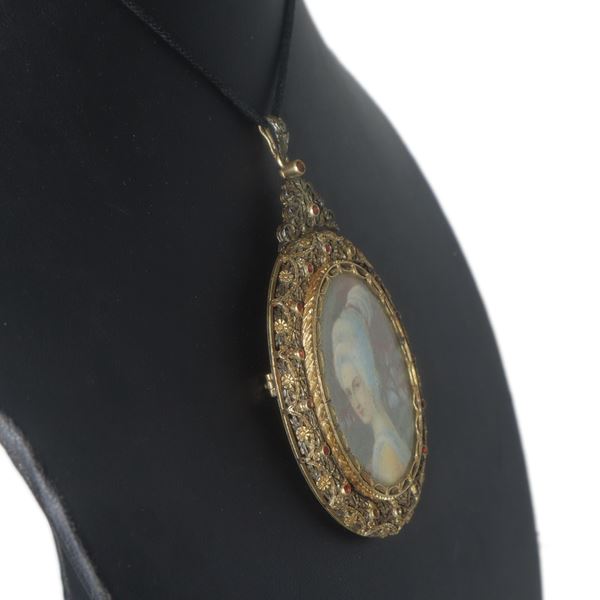 Gold filigree medallion with miniature, engraved glass with floral motifs, small grenadine stones on the edge, inizi XX secolo