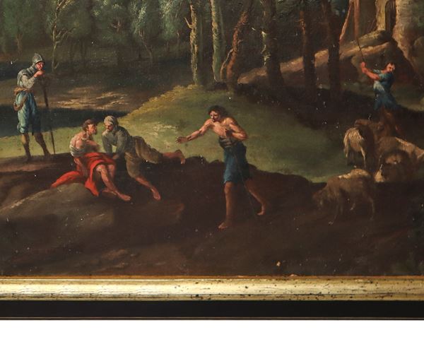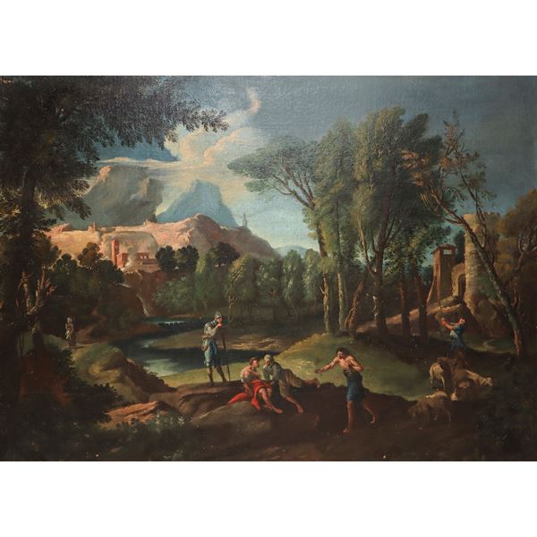 The scene depicted by Locatelli in the painting under examination is set in a typical Roman landscape, rural and lively, whose composition develops through successive planes in light and shadow until the blurred horizon. Andrea Locatelli, a pupil of Monsù Alto, worked in the service of many Roman noble families and experienced the cultural transformations of the city. The lively climate of Rome and the proximity to works by painters such as Salvator Rosa and Jan Frans van Bloemen significantly influenced Locatelli's artistic production. His style is in fact inspired by the realism of his contemporary models and in his works an atmosphere of an Arcadian, pastoral and allegorical character comes to life.