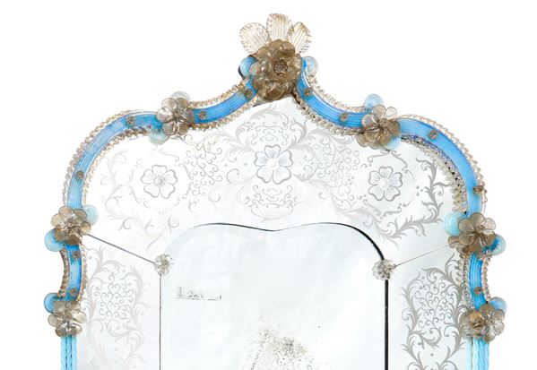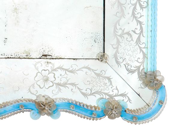 Mirror in engraved Murano glass with blue glass finishes, 19th century