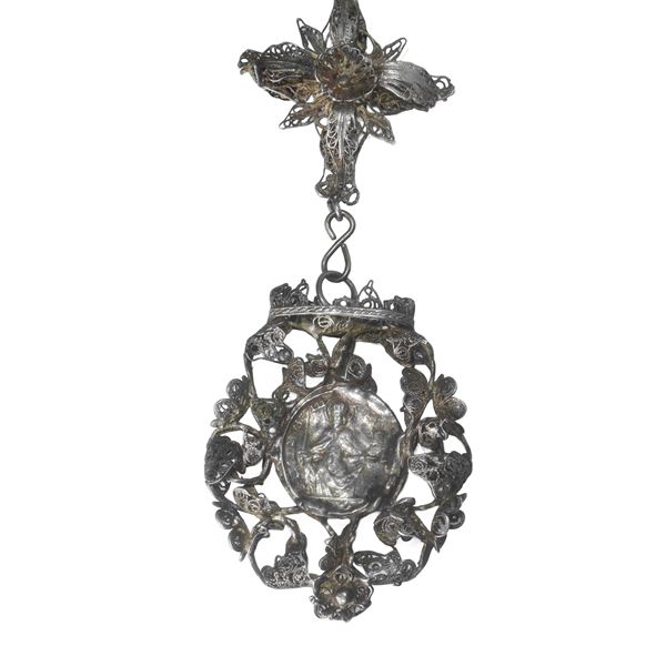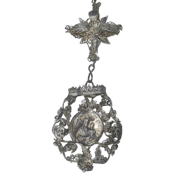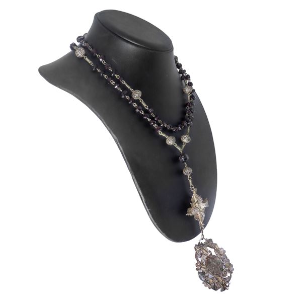 Rosary with filigree silver medallions and filigree cross, garnet glass beads