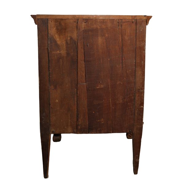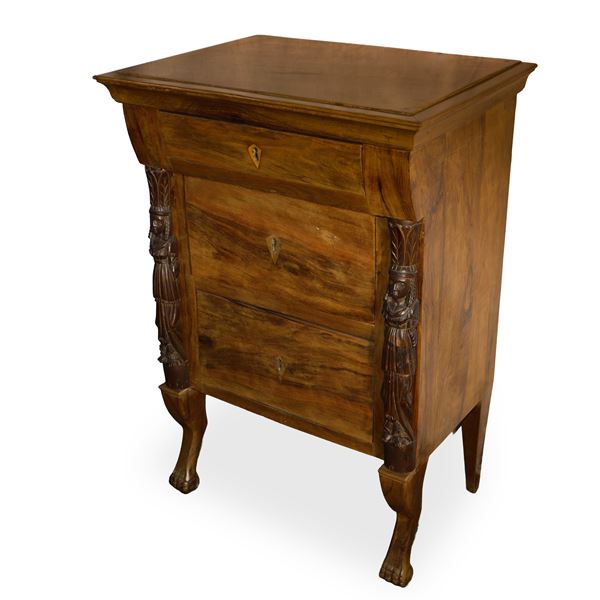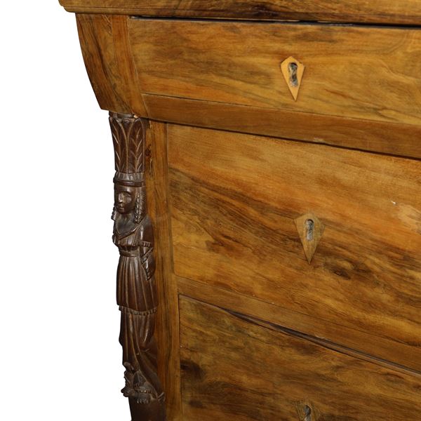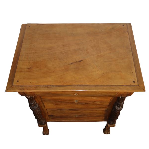 Small Empire chest of drawers with 3 drawers in blond walnut with sphinxes carved and applied to the sides and feline feet, Ritorno d'Egitto XIX secolo