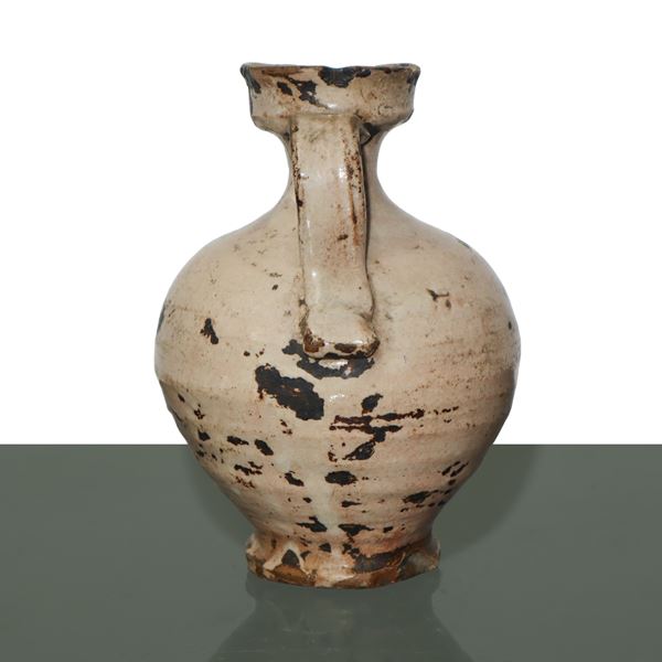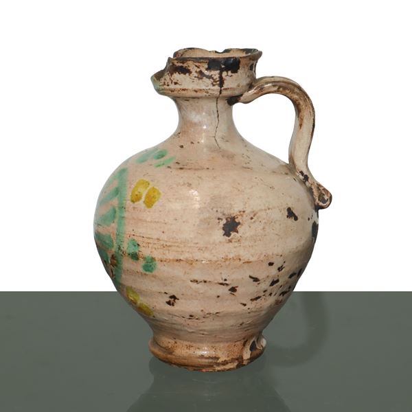 Caltagirone majolica jar with handle and green and yellow decorations, 19th century