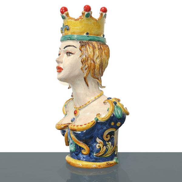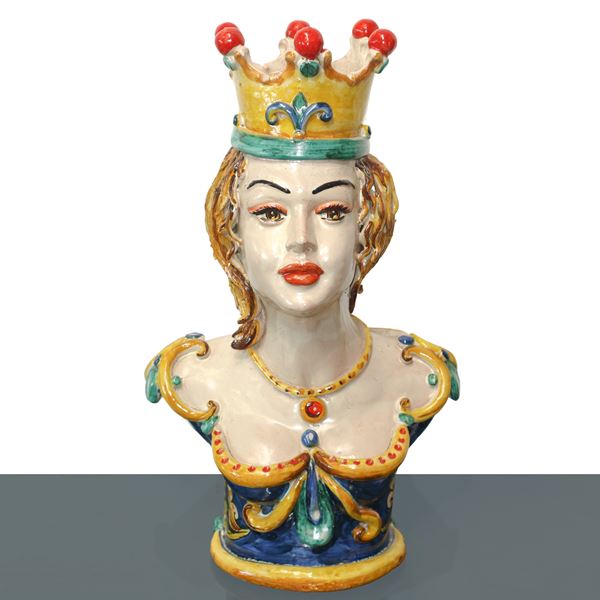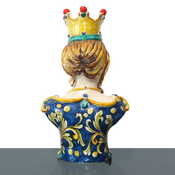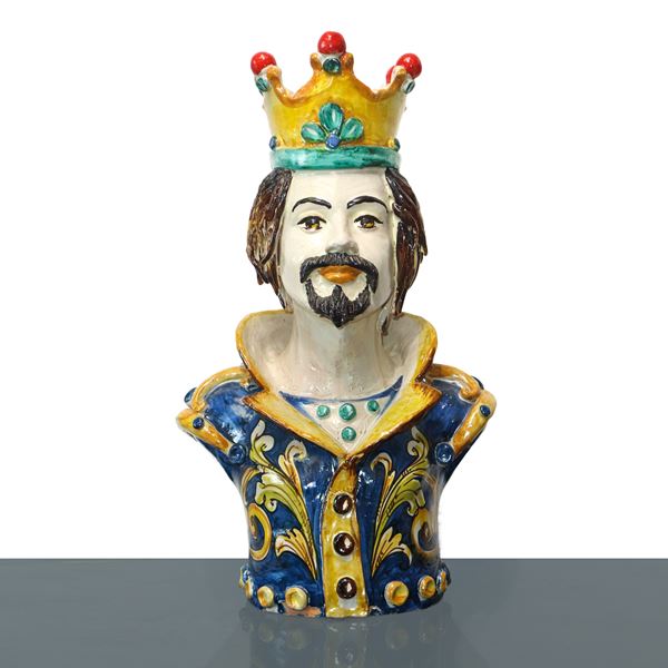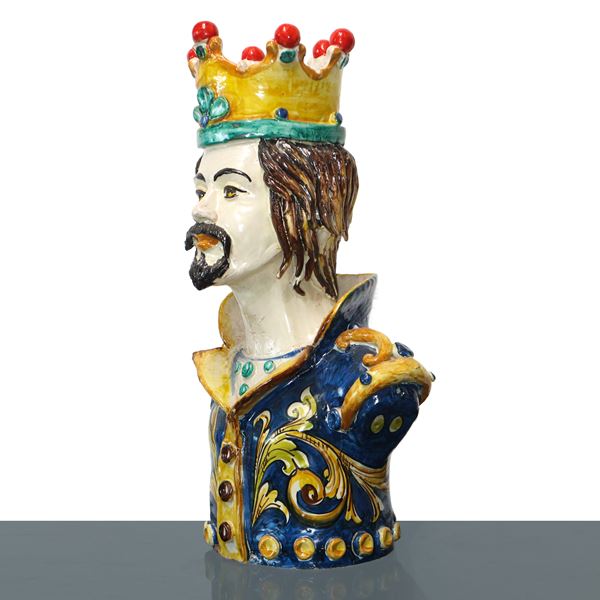 Terracotta busts of king and queen in glazed and painted polychrome majolica, early 20th century