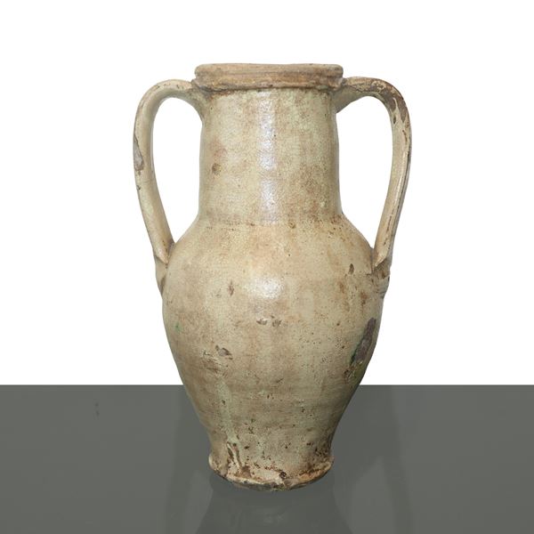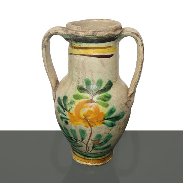 Two-handled amphora in Caltagirone majolica with polychrome flower on the front