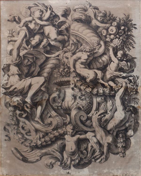 Cherubs, fauns and garlands of flowers and fruit in a lacquered wooden frame