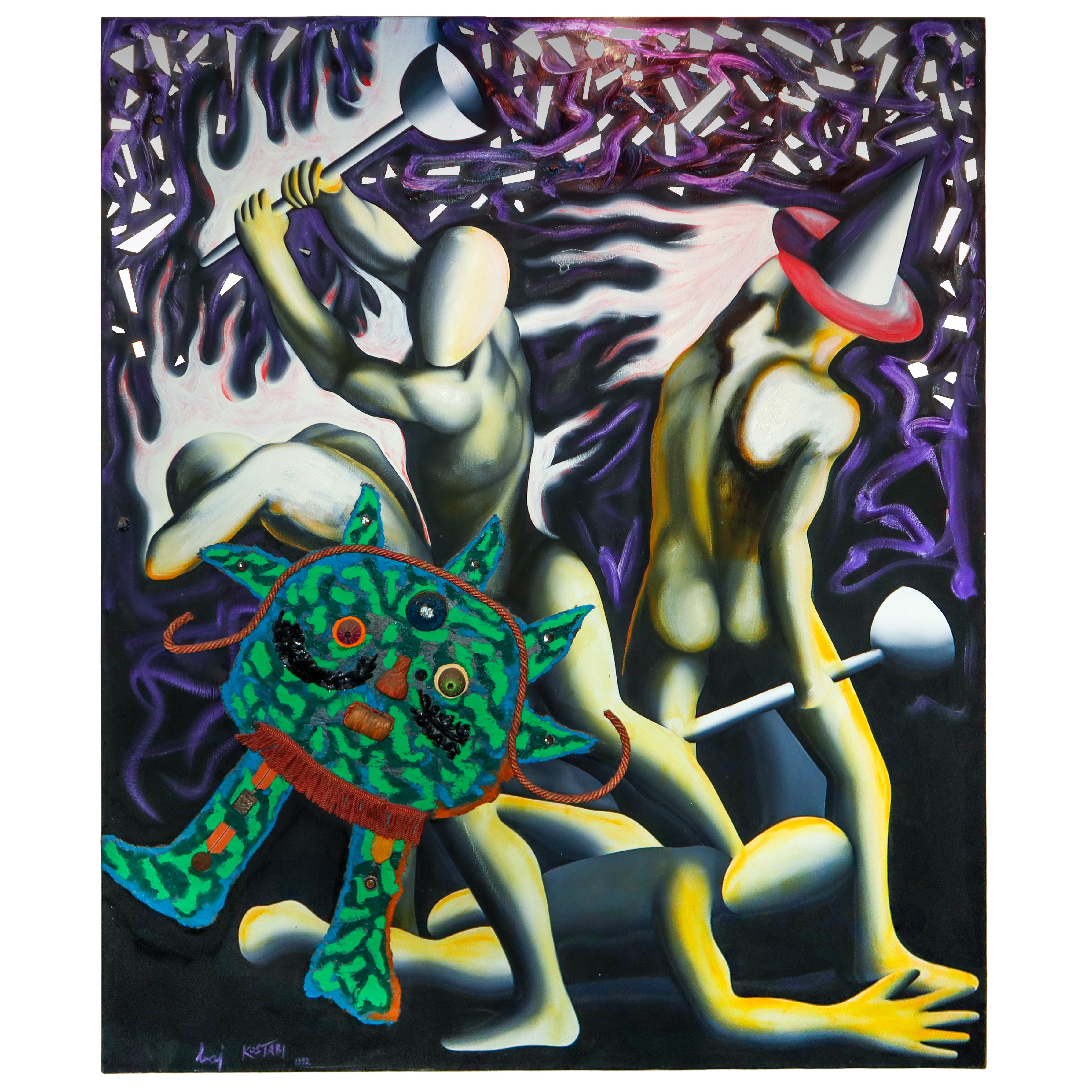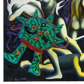This work was published on page 90 of the "Baj&Kostabi" catalog published by Fabbri Editore in 1992. Label on the back. Signed lower left.