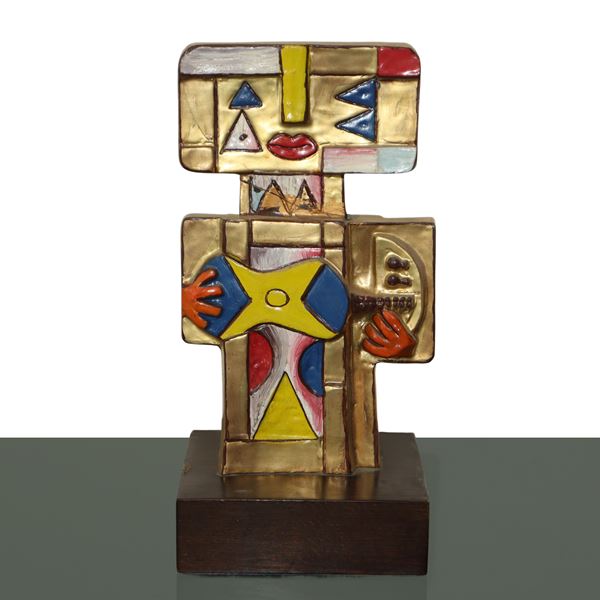 Double-sided sculpture in gold-plated resin and enamel. Signed on the left side. Certificate of authenticity for specimen no. 43/499. (Gluing present)