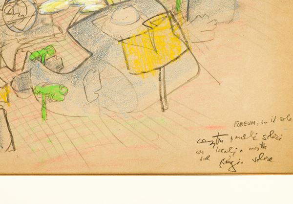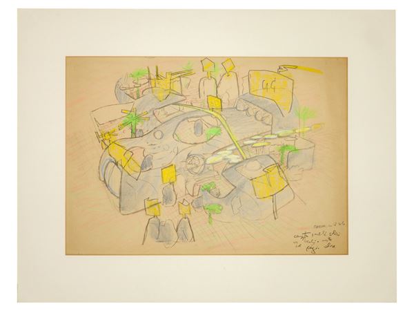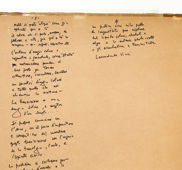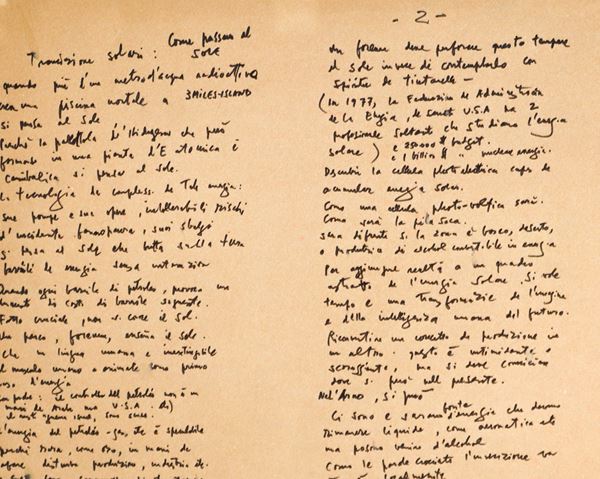 The text Matta wrote on the back of the drawing presents itself as a highly forward-thinking and visionary document: a true poetic-political manifesto on solar energy and a lucid and passionate reflection on the need to abandon destructive energy sources for an ethical, sustainable, and collective future, founded on the use of sunlight. The approach is one of integrated ecological thinking, where technology, nature, culture, and politics must converge.