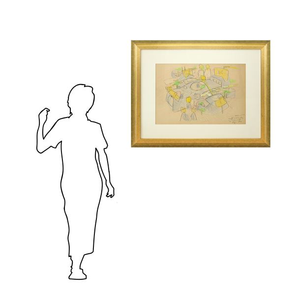 Extremely rare work with a descriptive text on the back, handwritten by the painter, describing the image on the front. Titled lower right. Informal positive opinion from the Matta Archives.