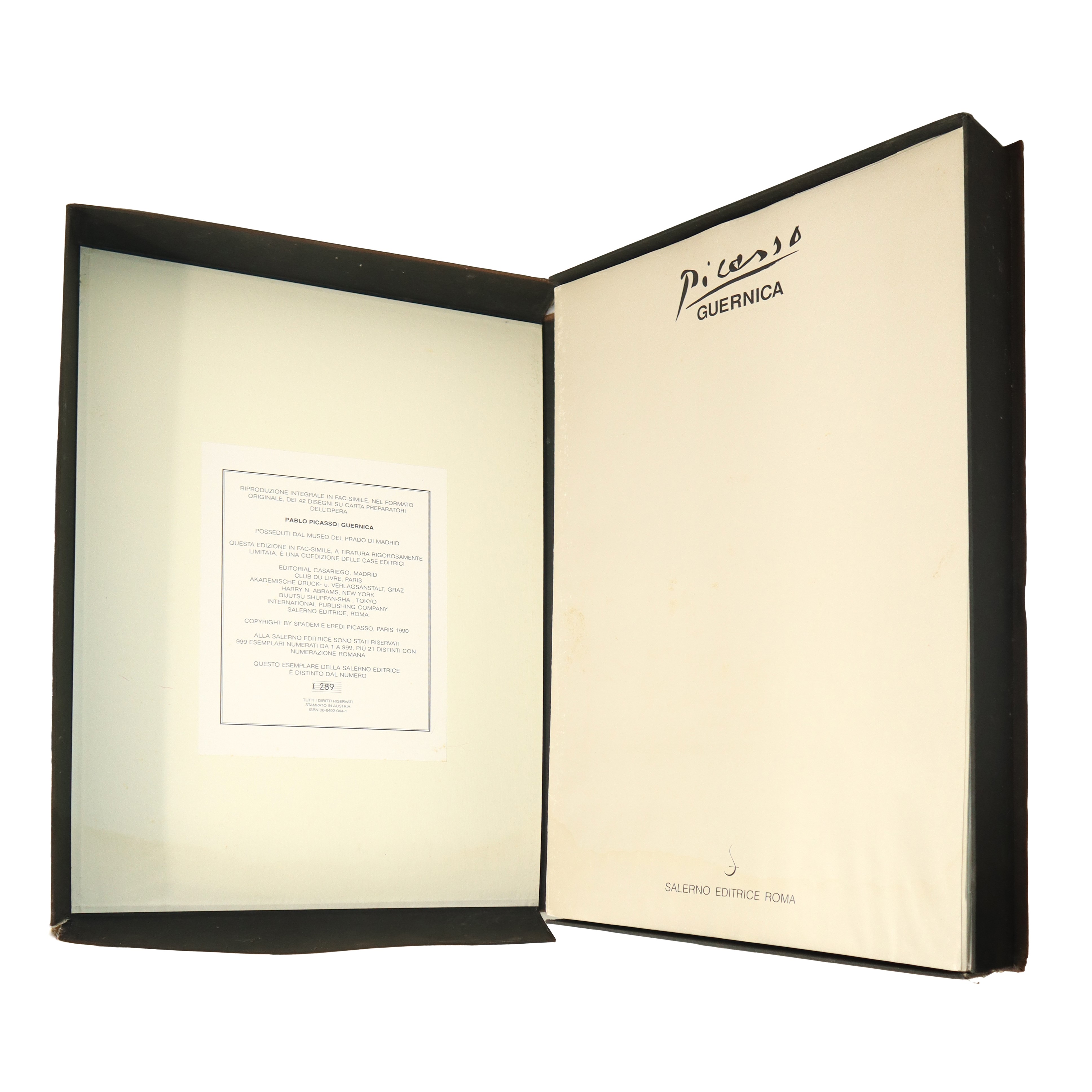 This certificate of authenticity is provided by Salerno editrice, based in Rome at Via di Donna Olimpia 186, which certifies that the collection is a strictly facsimile reproduction of Picasso's studies for Guernica, previously approved by the Prado Museum, SPADEM, and the Picasso Heirs, who retain the copyright.