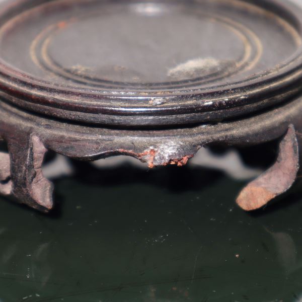 Japanese white porcelain vase with polychrome geisha decoration and Japanese inscriptions. Red Japanese character stamp on the base. Wooden base, missing one piece.