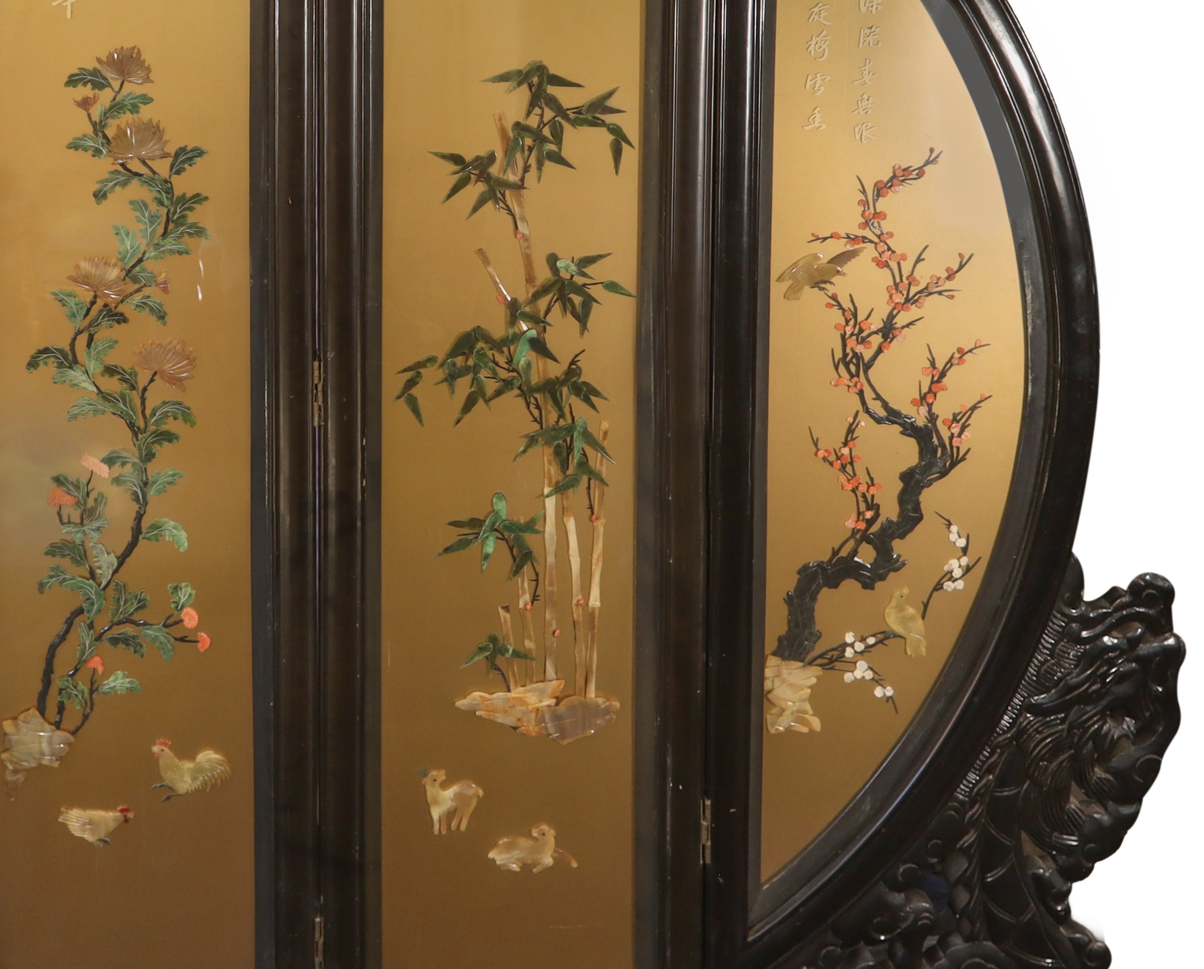 Large circular Chinese 3-panel screen with floral decorations and inscriptions