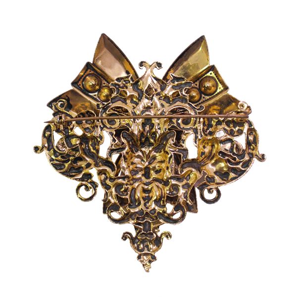 Heart-shaped brooch with a central bow and colored rhinestones on the sides, little angels