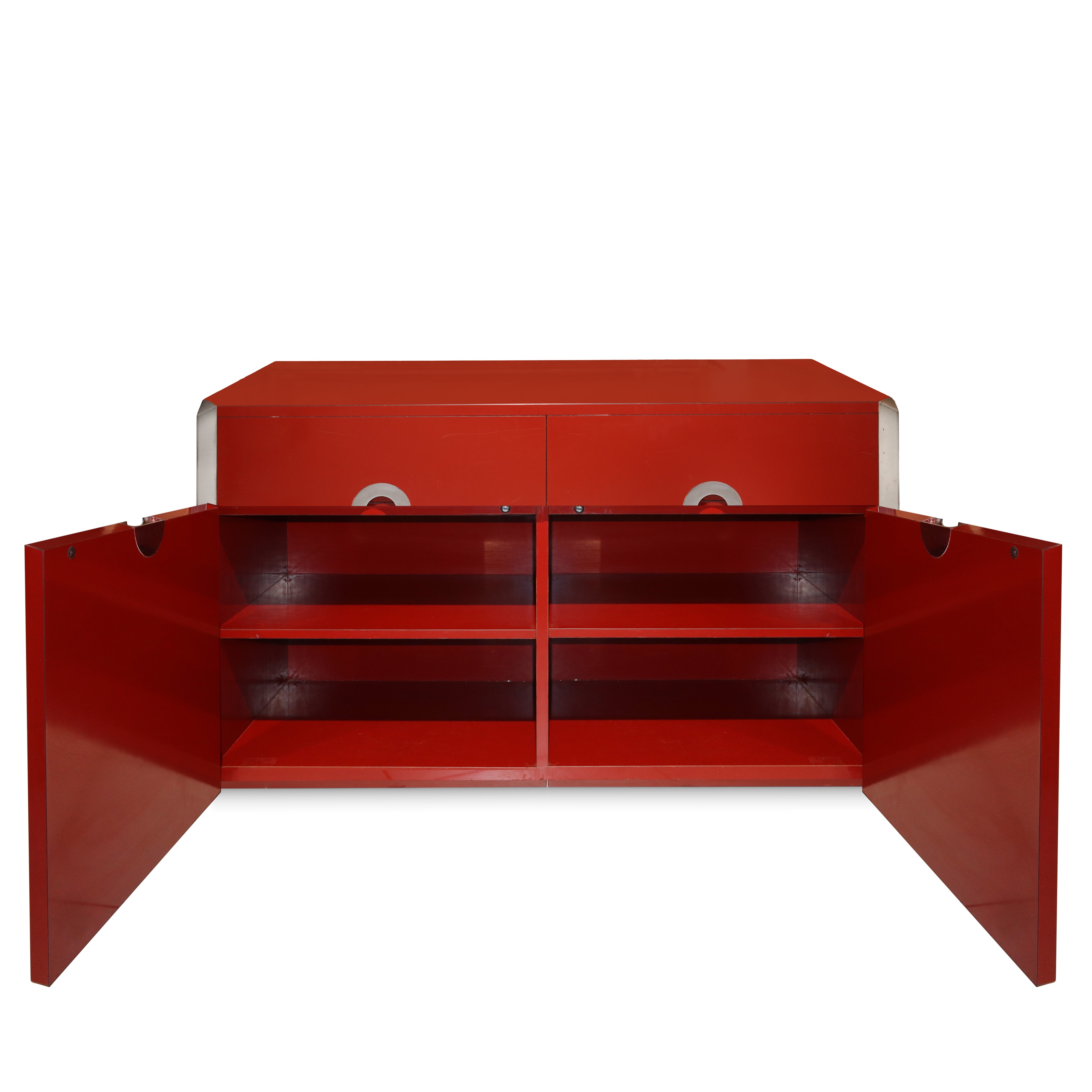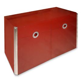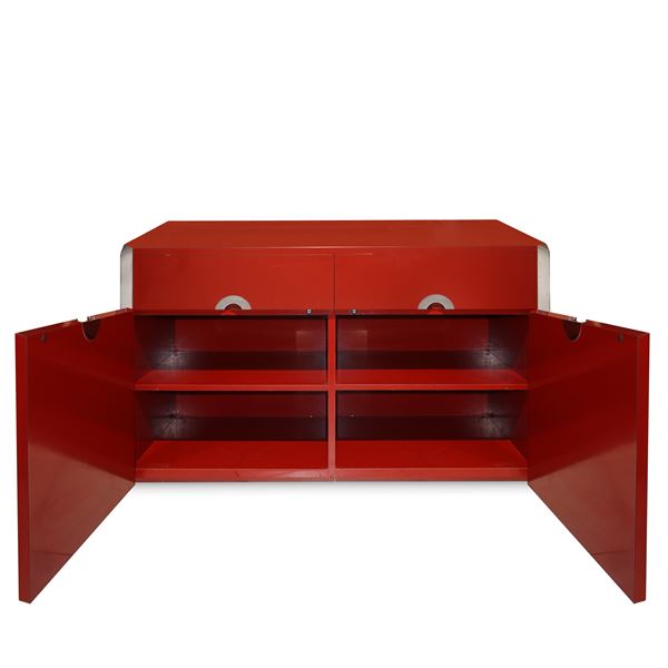 Alveo model sideboard in red lacquer and chrome details, 70s