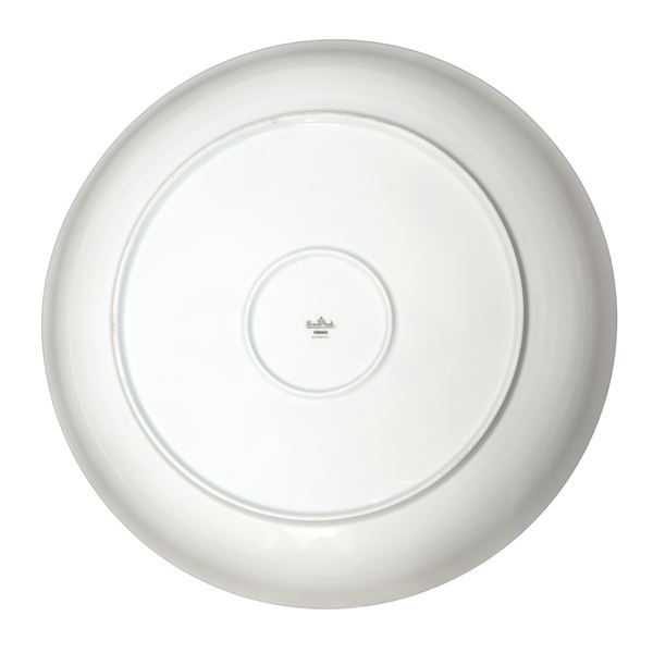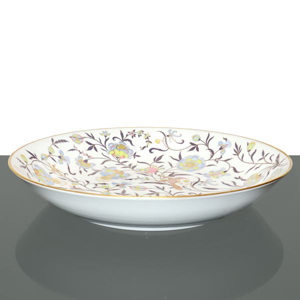 Large decorative centerpiece plate in polychrome porcelain decorated with birds and floral motifs