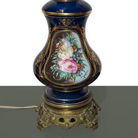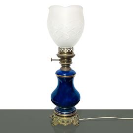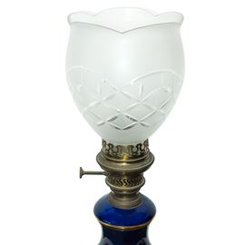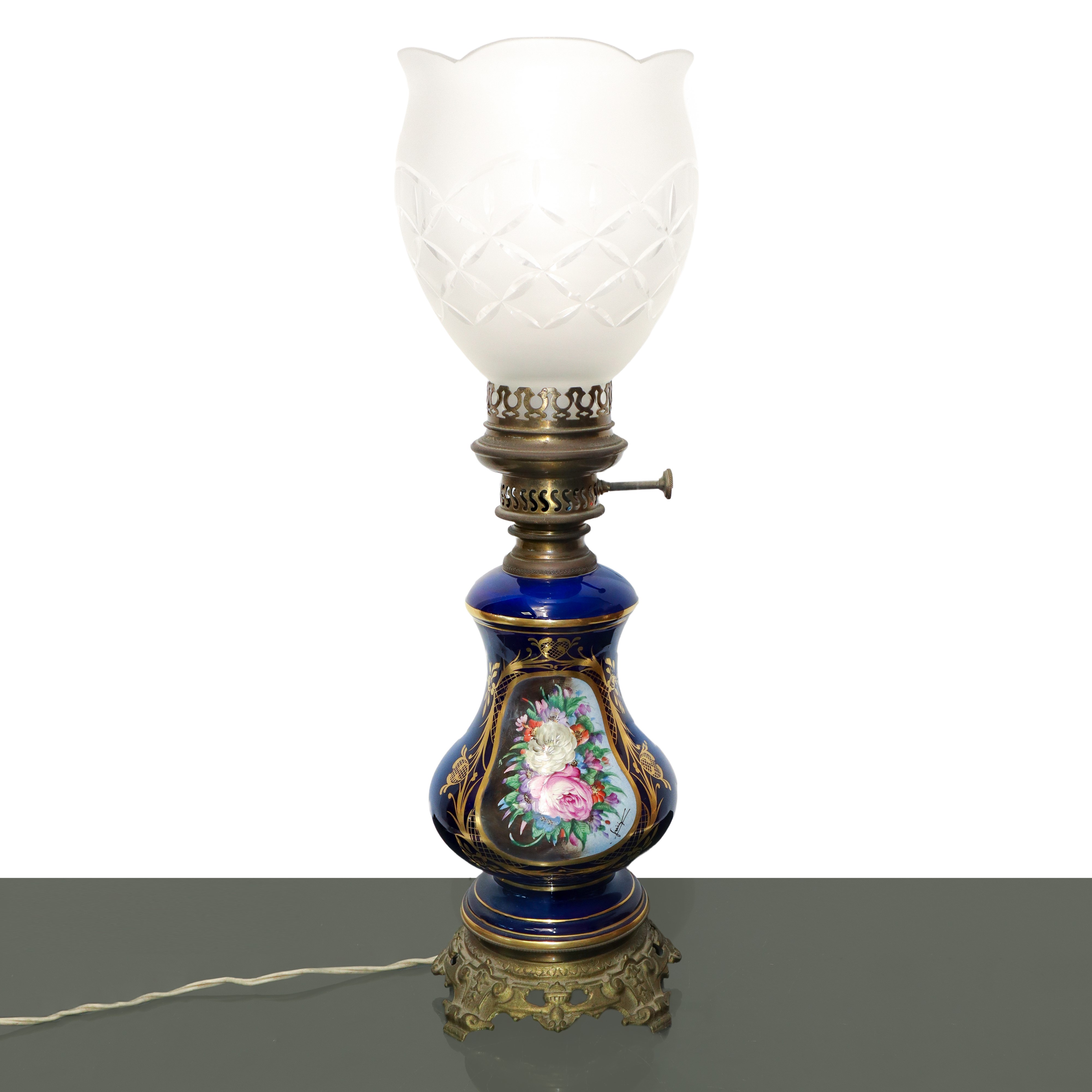 Blue porcelain lamp with polychrome flowers painted on the front within a golden oval with a carved glass diffuser