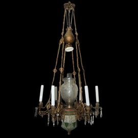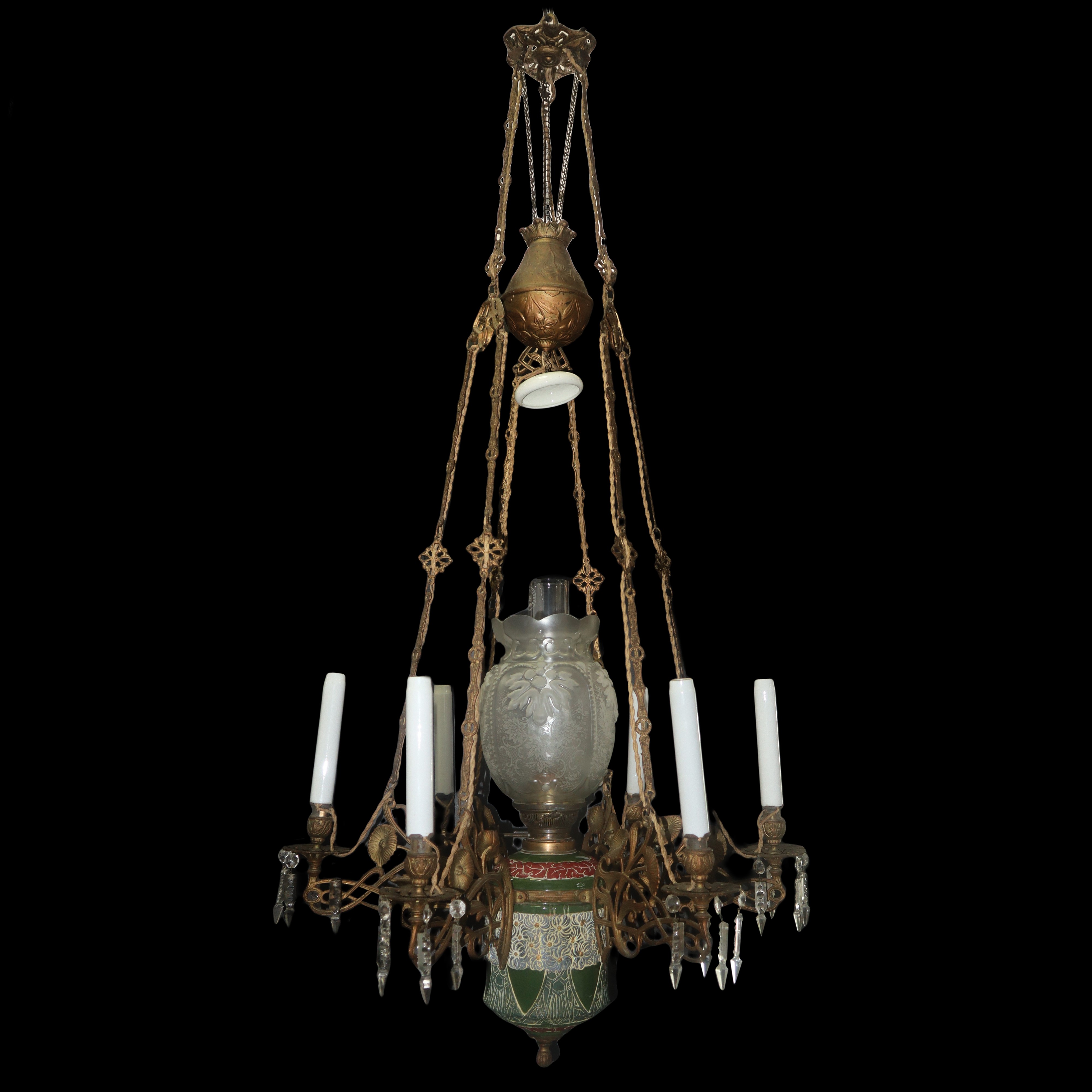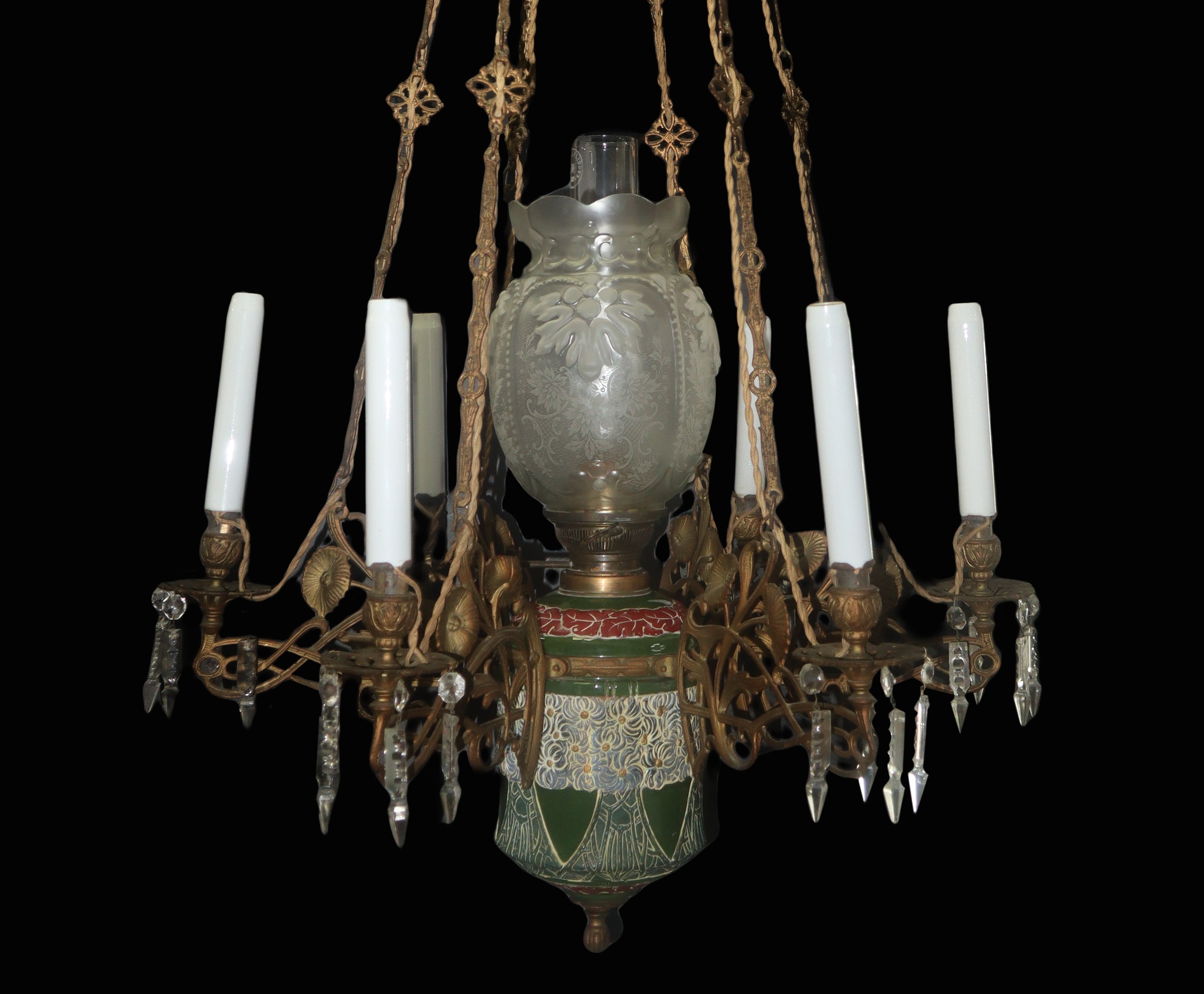 Electrified suspension lamp with gold metal structure, glass beads and polychrome majolica centerpiece with 6 lights, Art Nouveau period