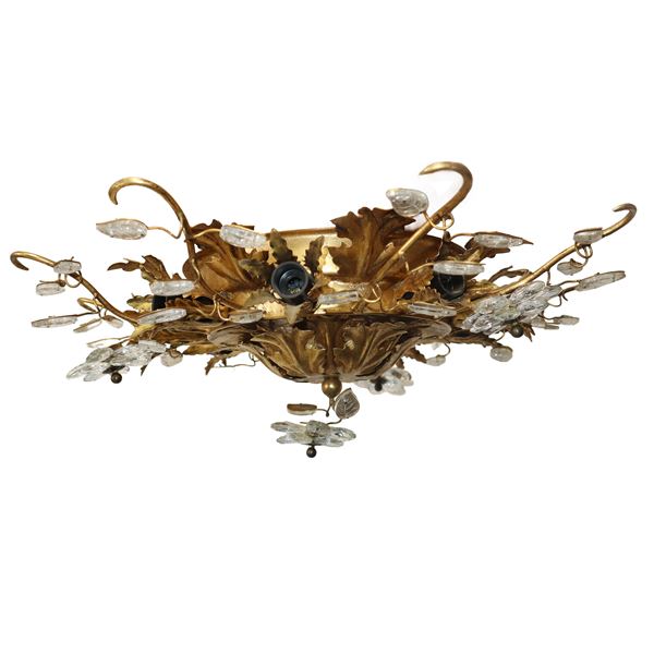 Small round ceiling light in gold metal and glass flowers with 8 lights