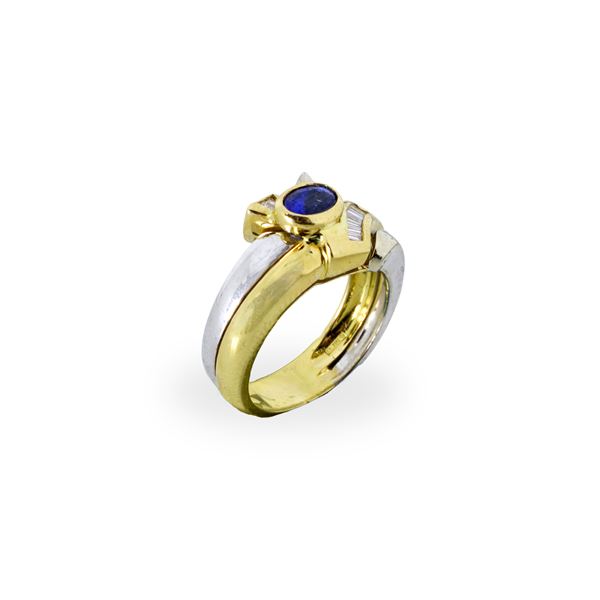 18kt white and yellow gold ring with sapphire and brilliant-cut diamonds