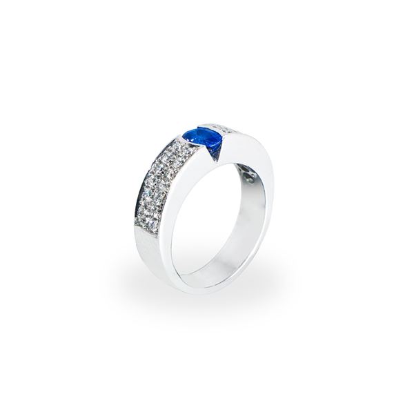 18kt white gold ring with brilliant-cut diamonds and a central silon sapphire