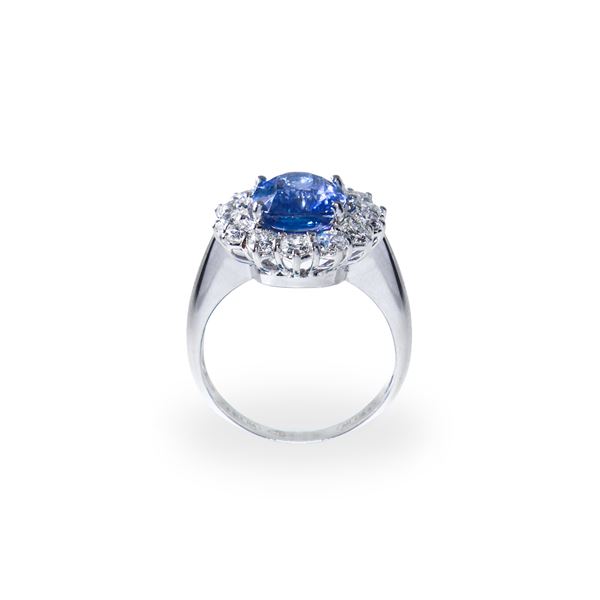18kt white gold ring with natural sapphire (from Sri Lanka) and diamond ring