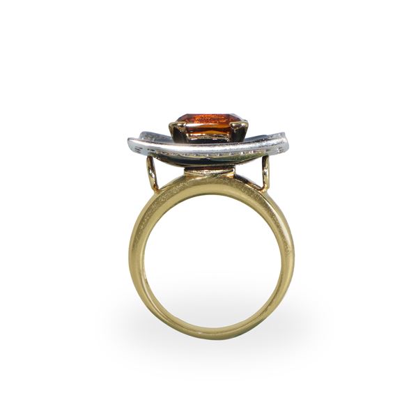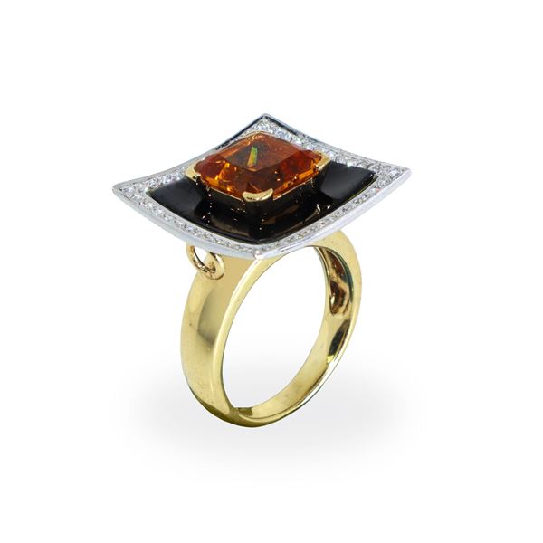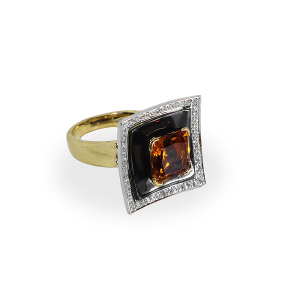 18kt yellow and white gold ring, with central citrine topaz on onyx with diamond ring