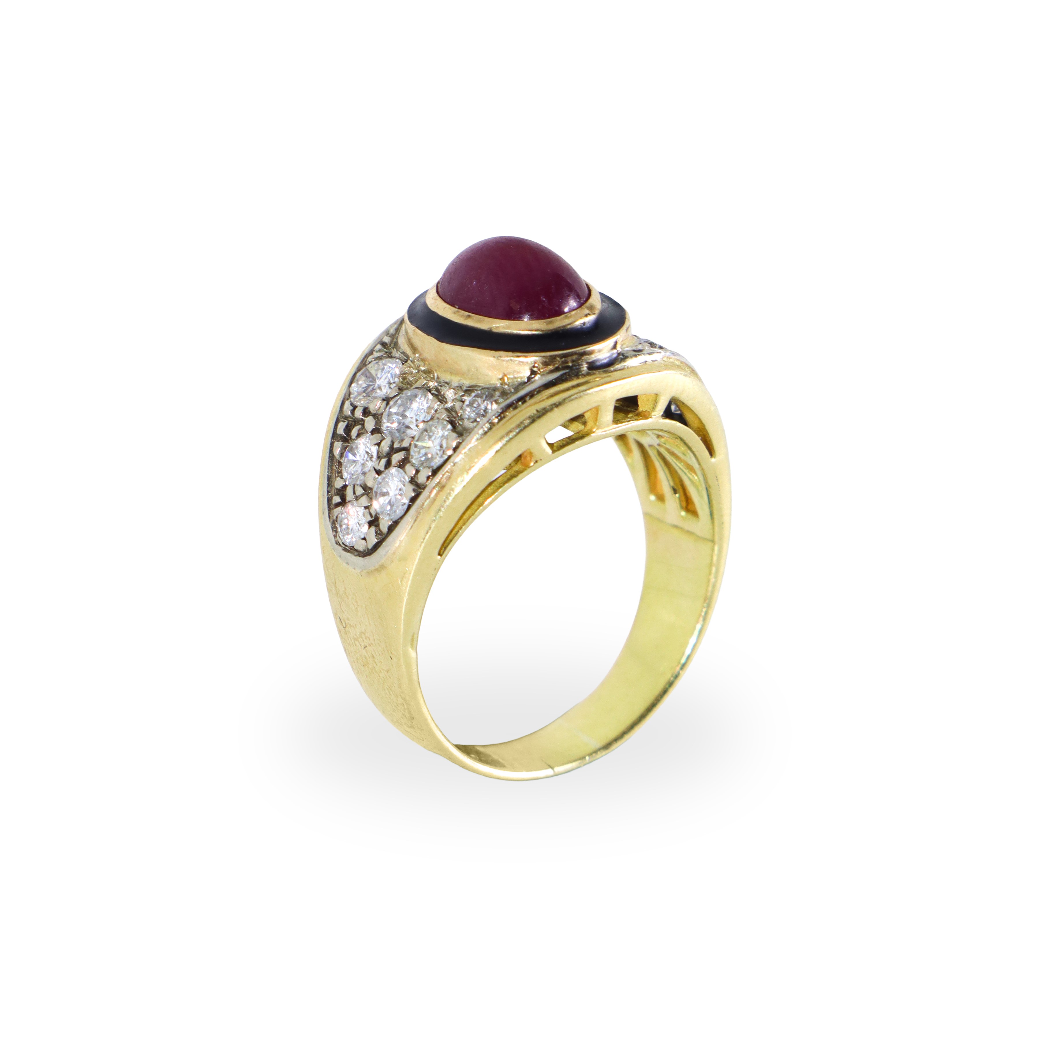 750 yellow gold band ring with diamond pavé and central ruby
