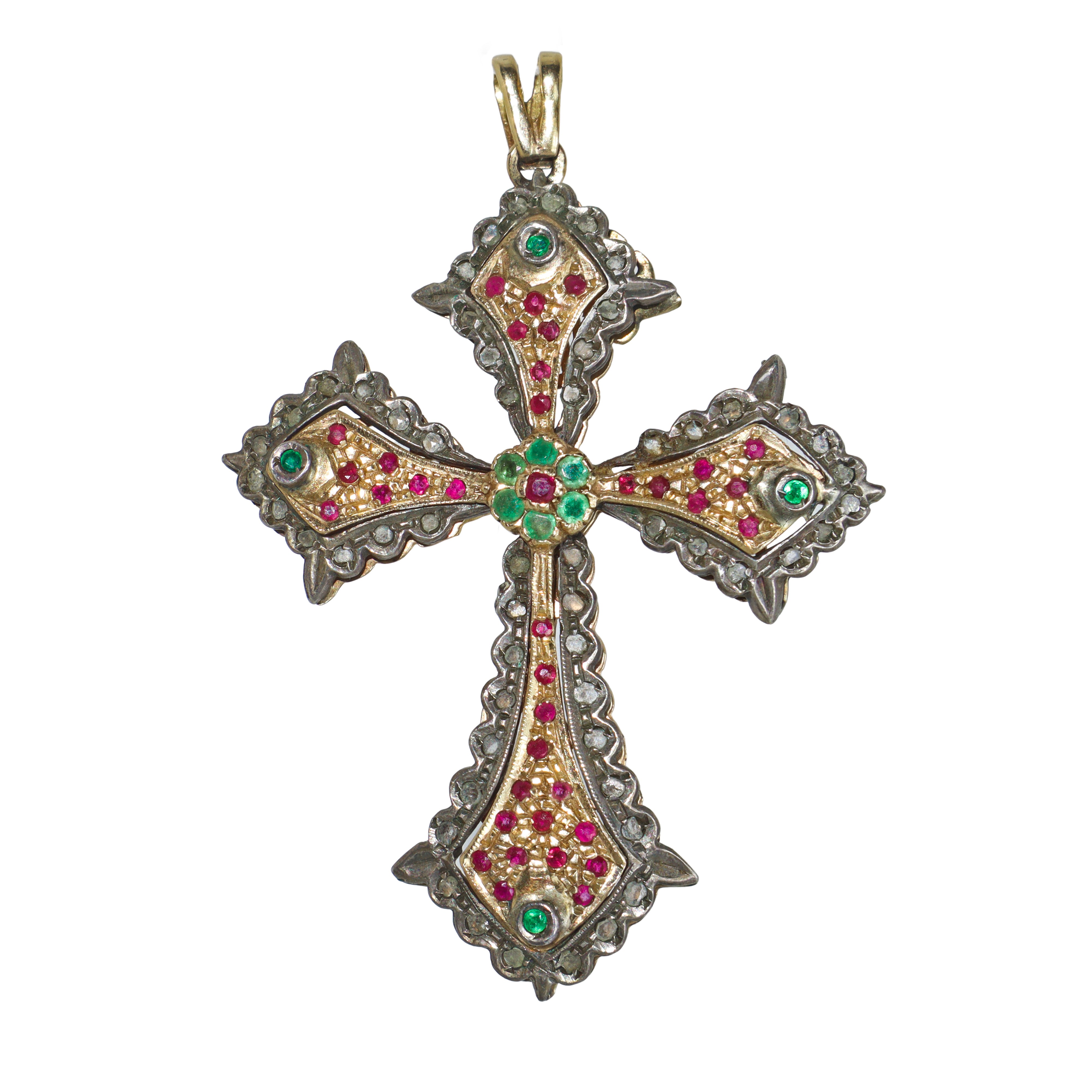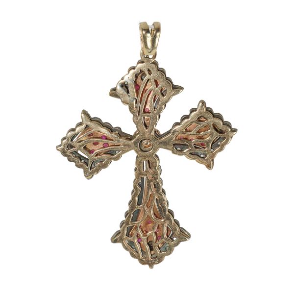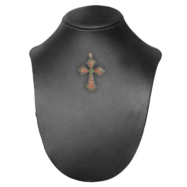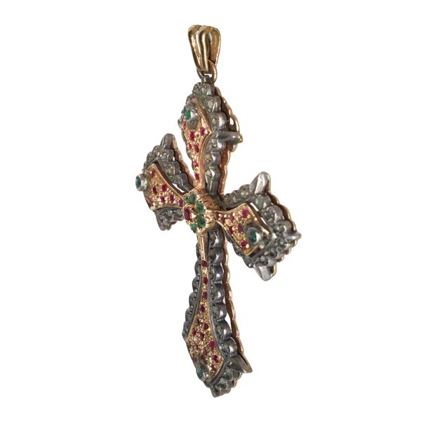 Cross in silver and low-grade gold with rubies, emeralds and brilliant-cut diamonds