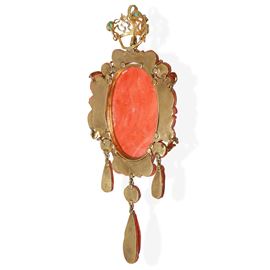 Large pendant in 500 gold and emeralds and sculpture of a woman in coral