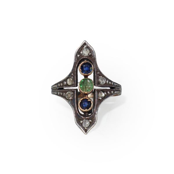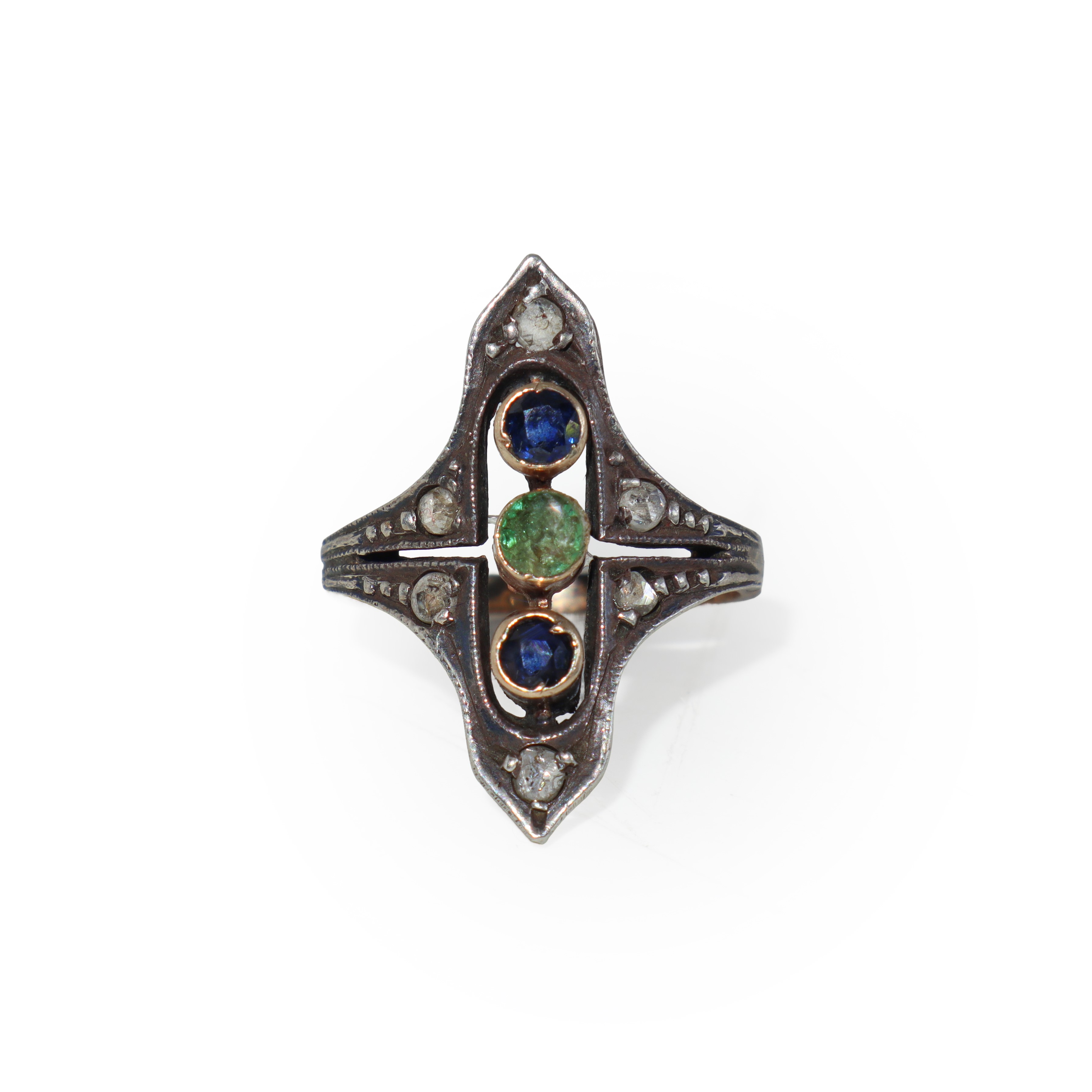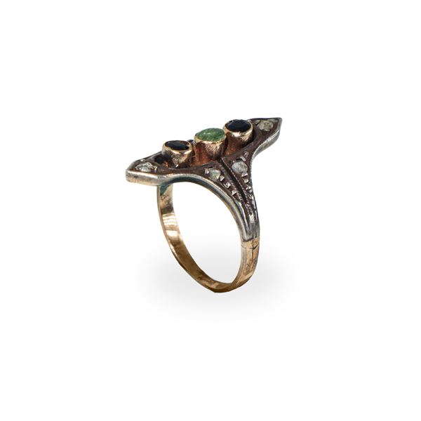 Low-grade gold and silver ring with old-cut stones and diamonds