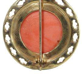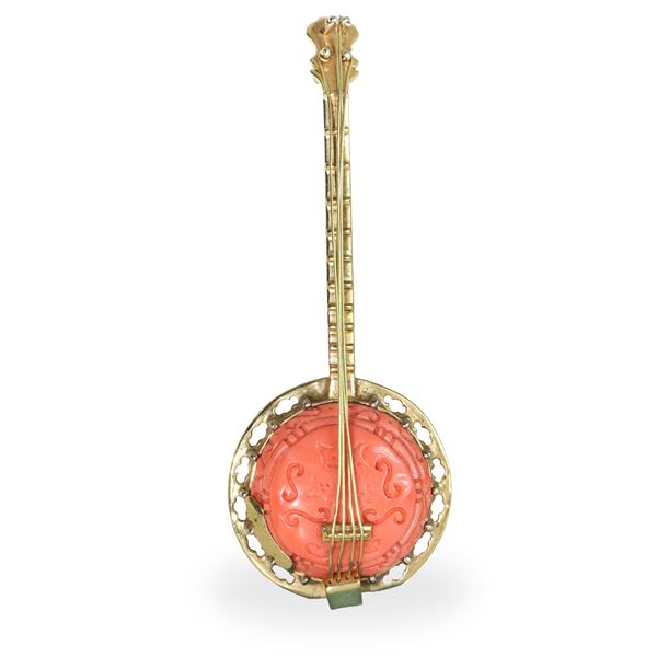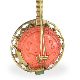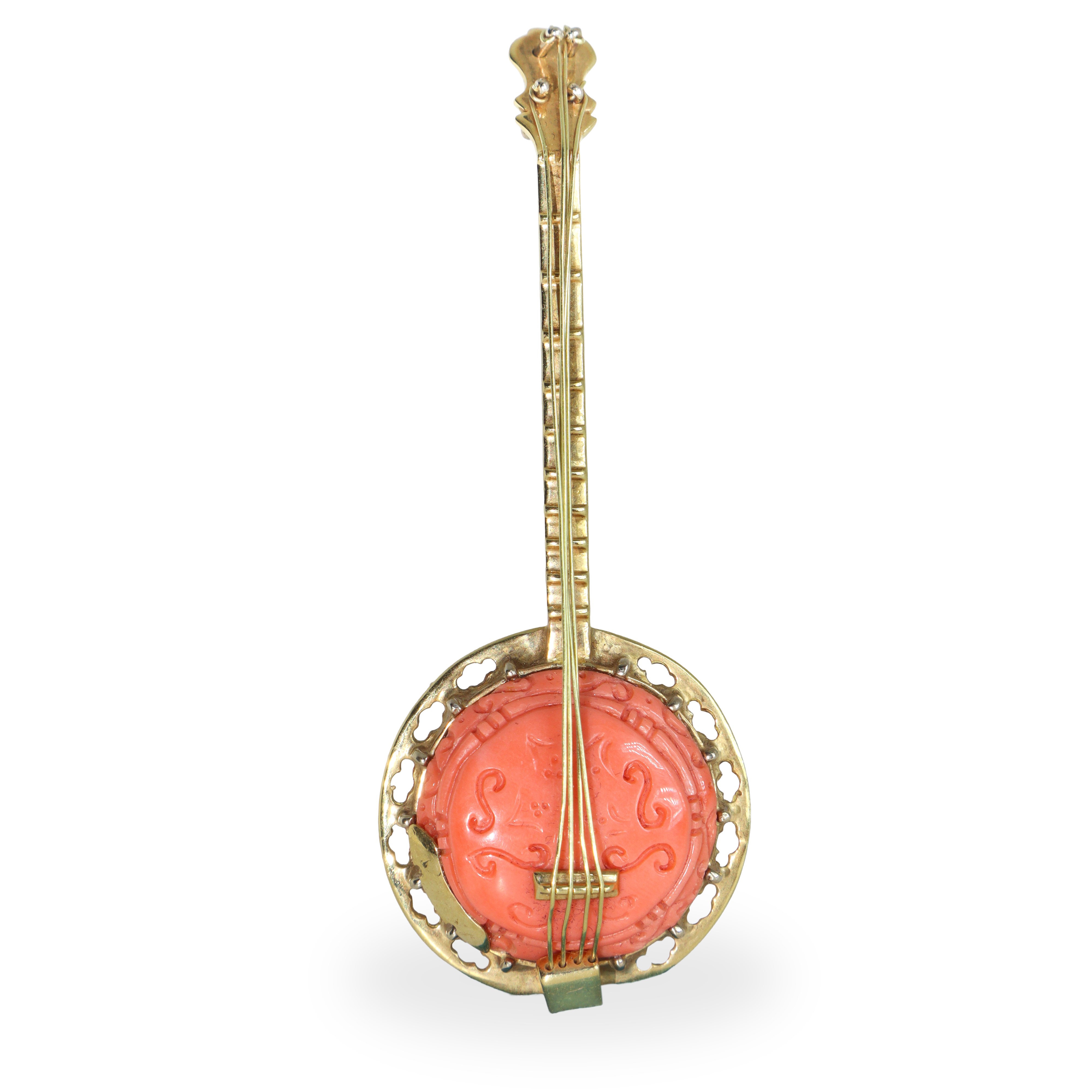 Mandolin-shaped brooch in 750 yellow gold and coral