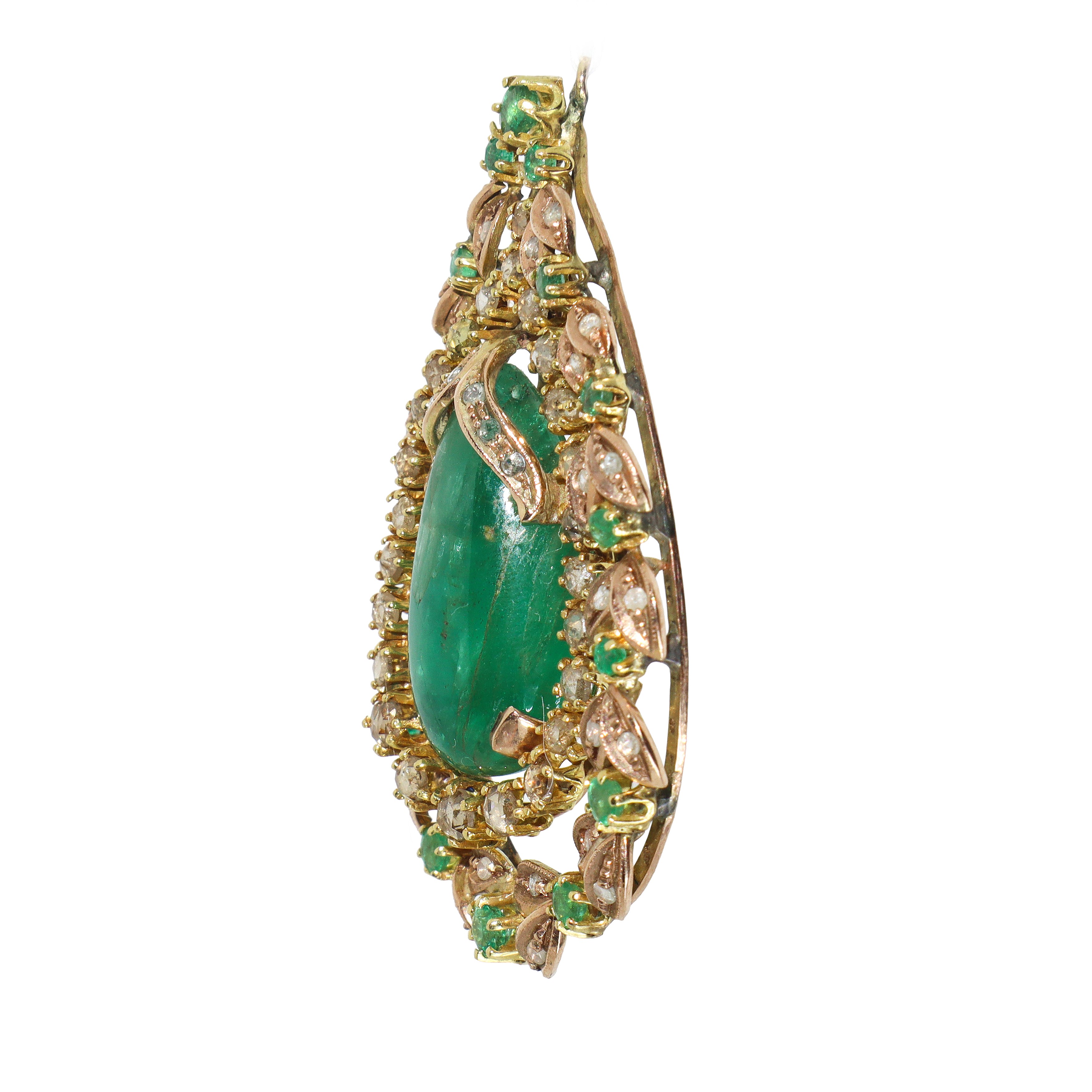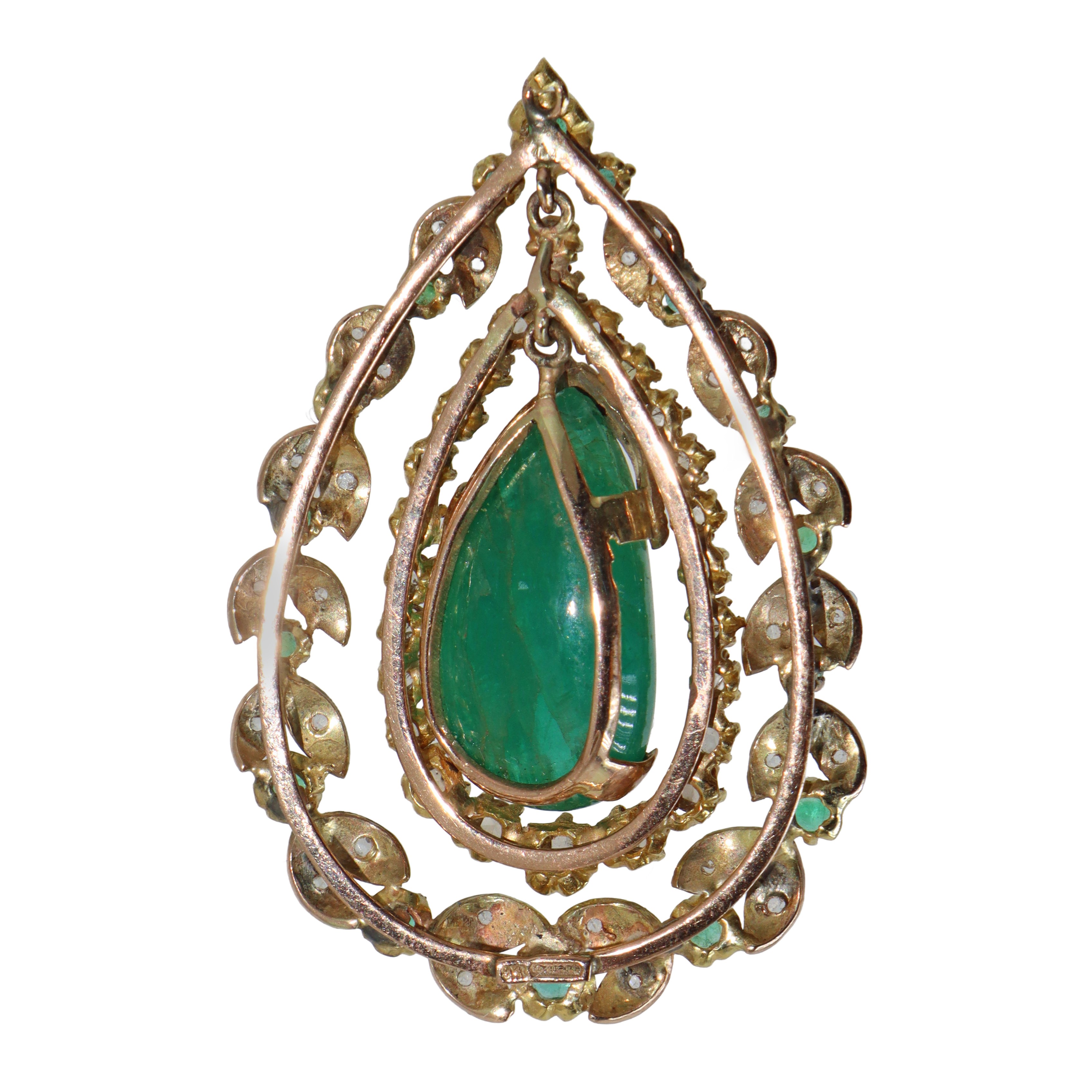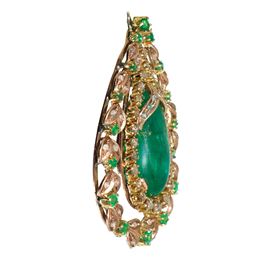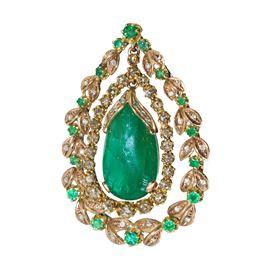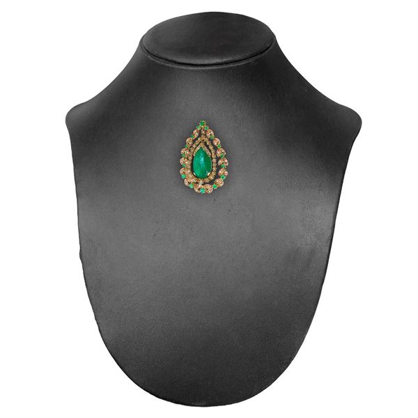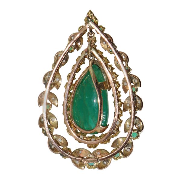 Pendant in low-grade gold with a cabochon emerald drop in the center and two rows of brilliant-cut diamonds and emeralds