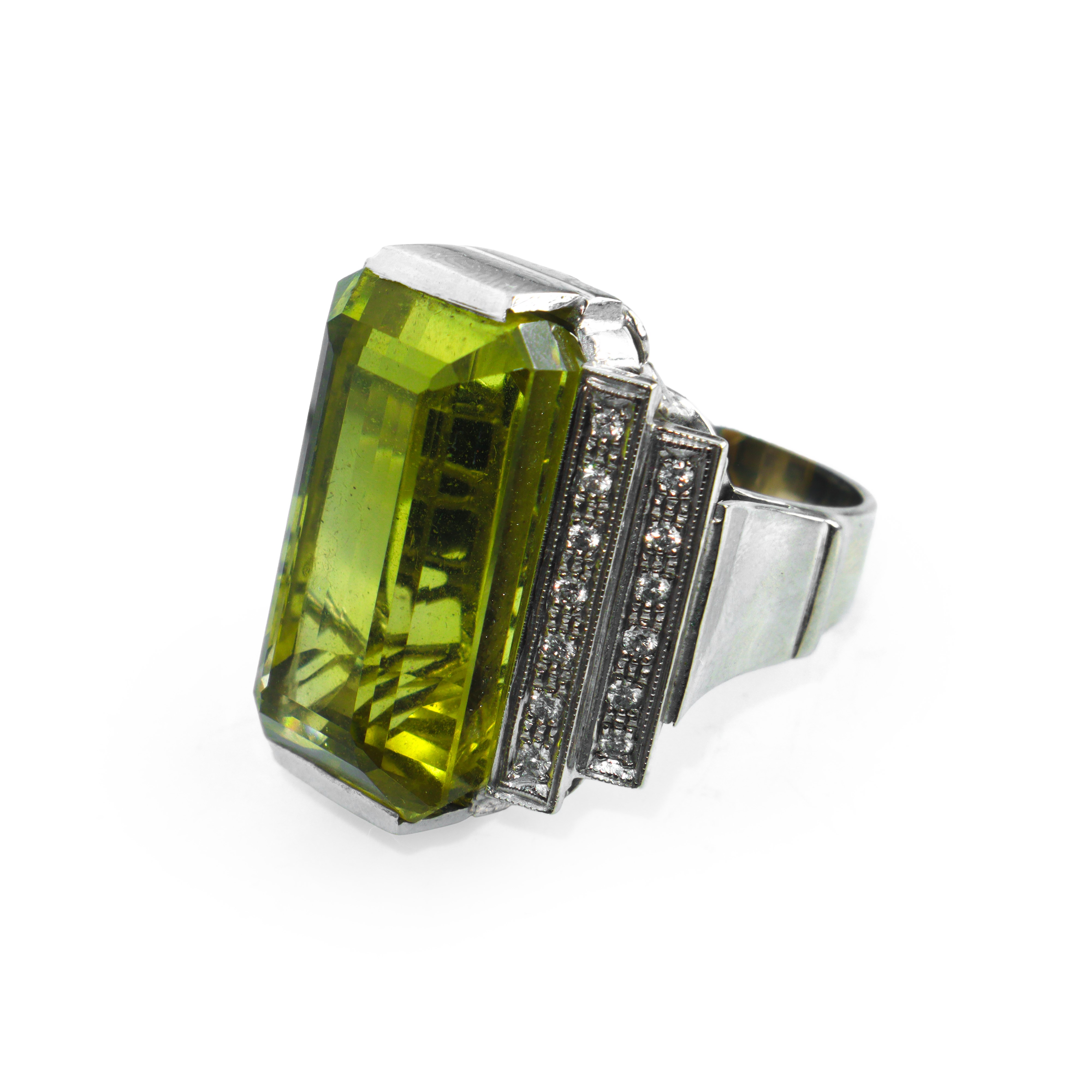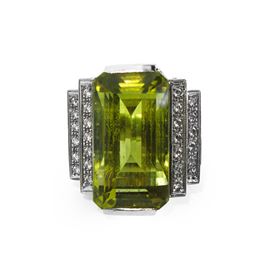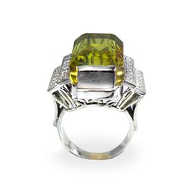 White gold cocktail ring with central corundum flanked by a double row of diamonds on each side