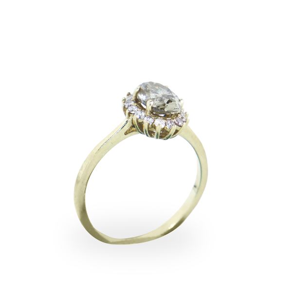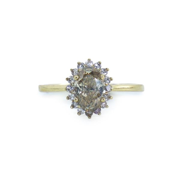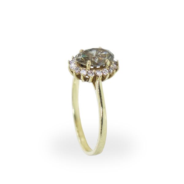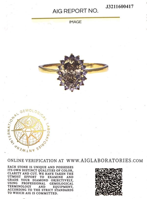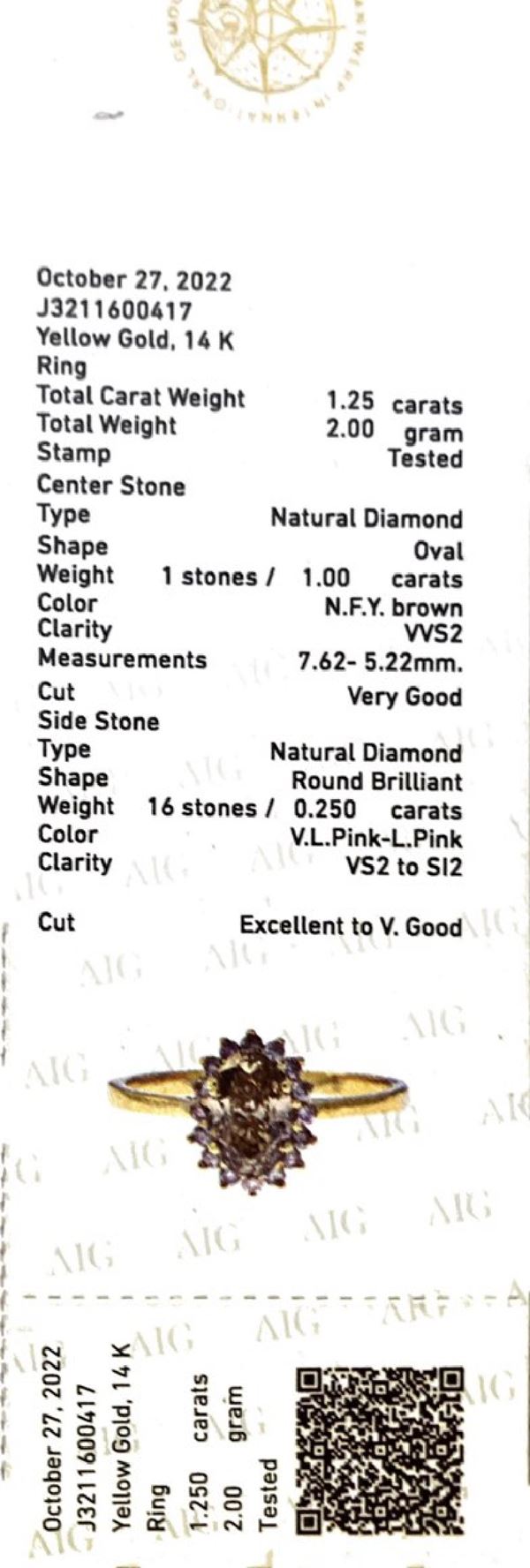 Yellow gold ring with diamonds, 16 very light pink diamonds on the bezel and a natural fancy yellowish brown diamond in the center.