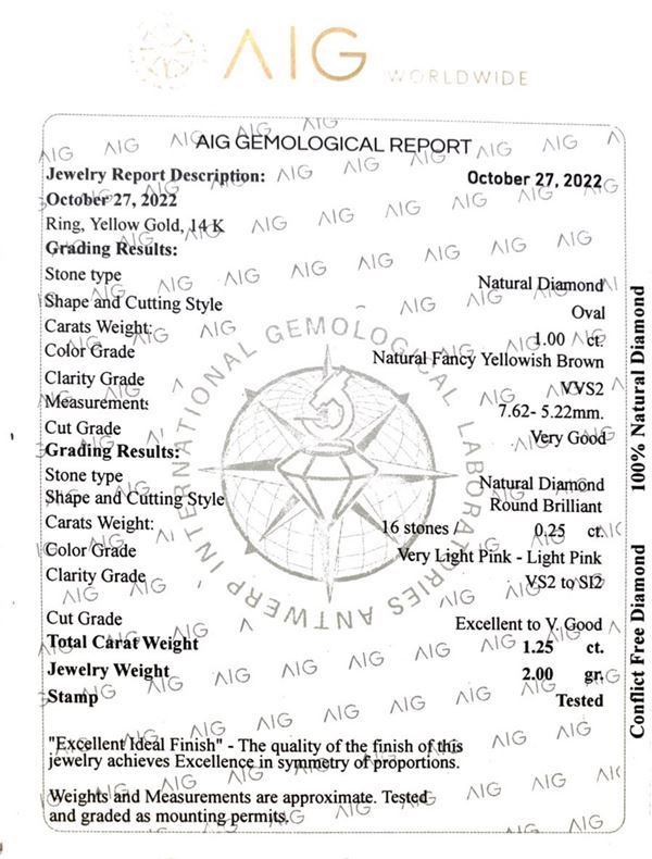 Fancy yellowish brown diamond carat weight: 1 ct. 16 bezel diamond carat weight: 0.25 ct.