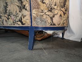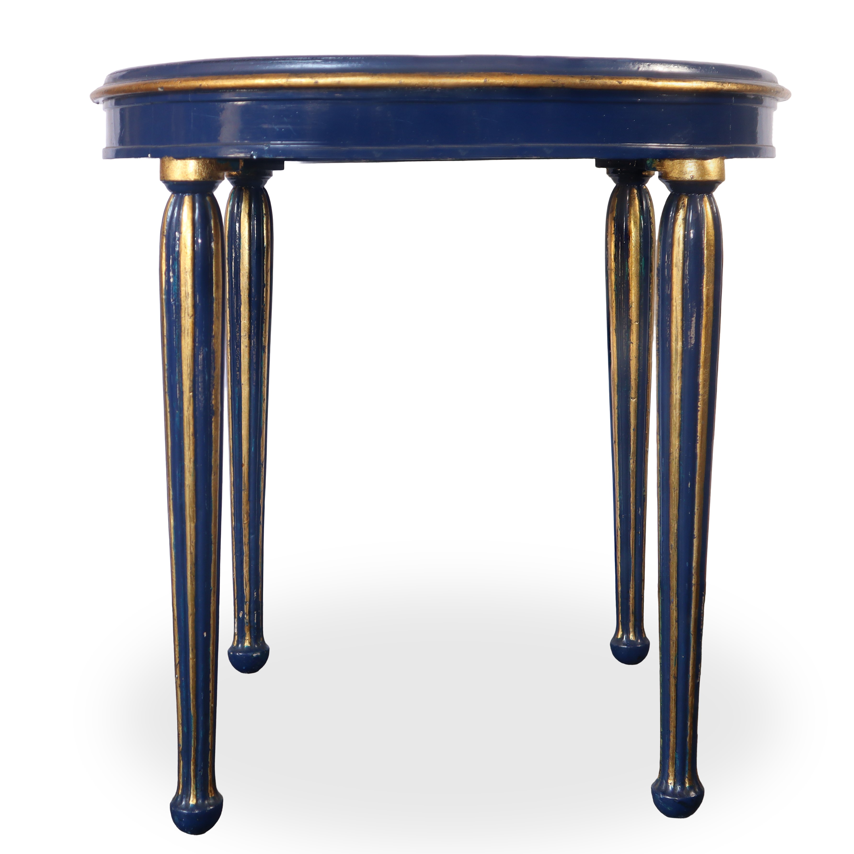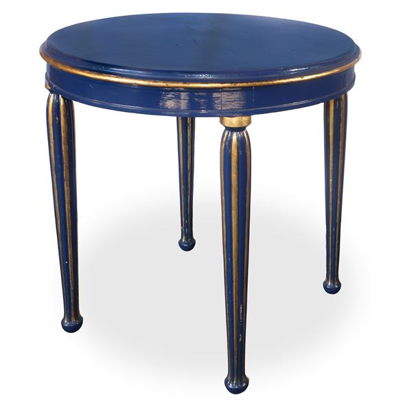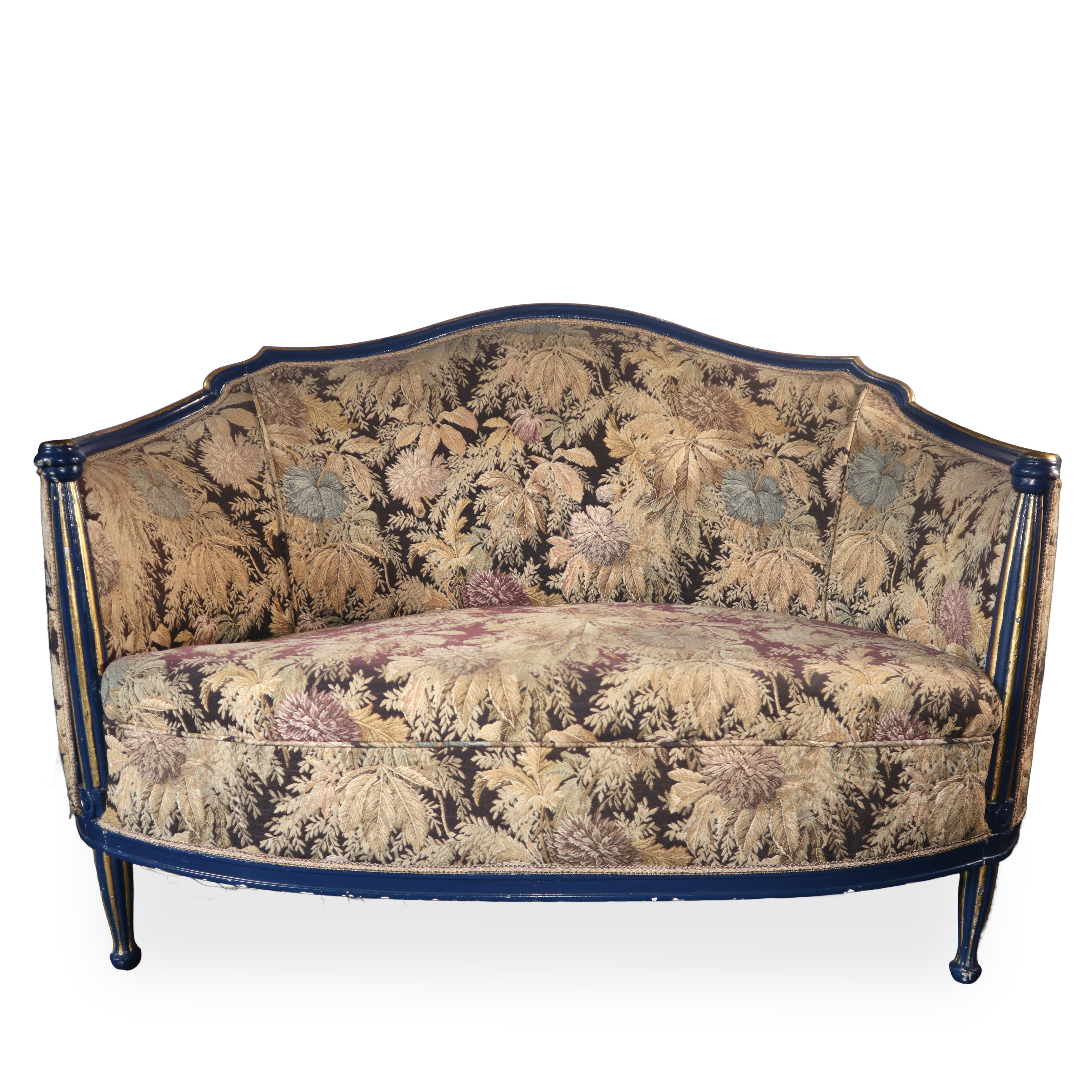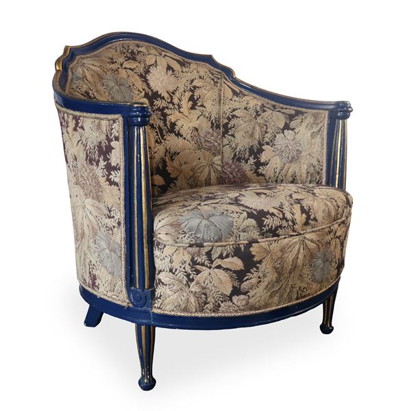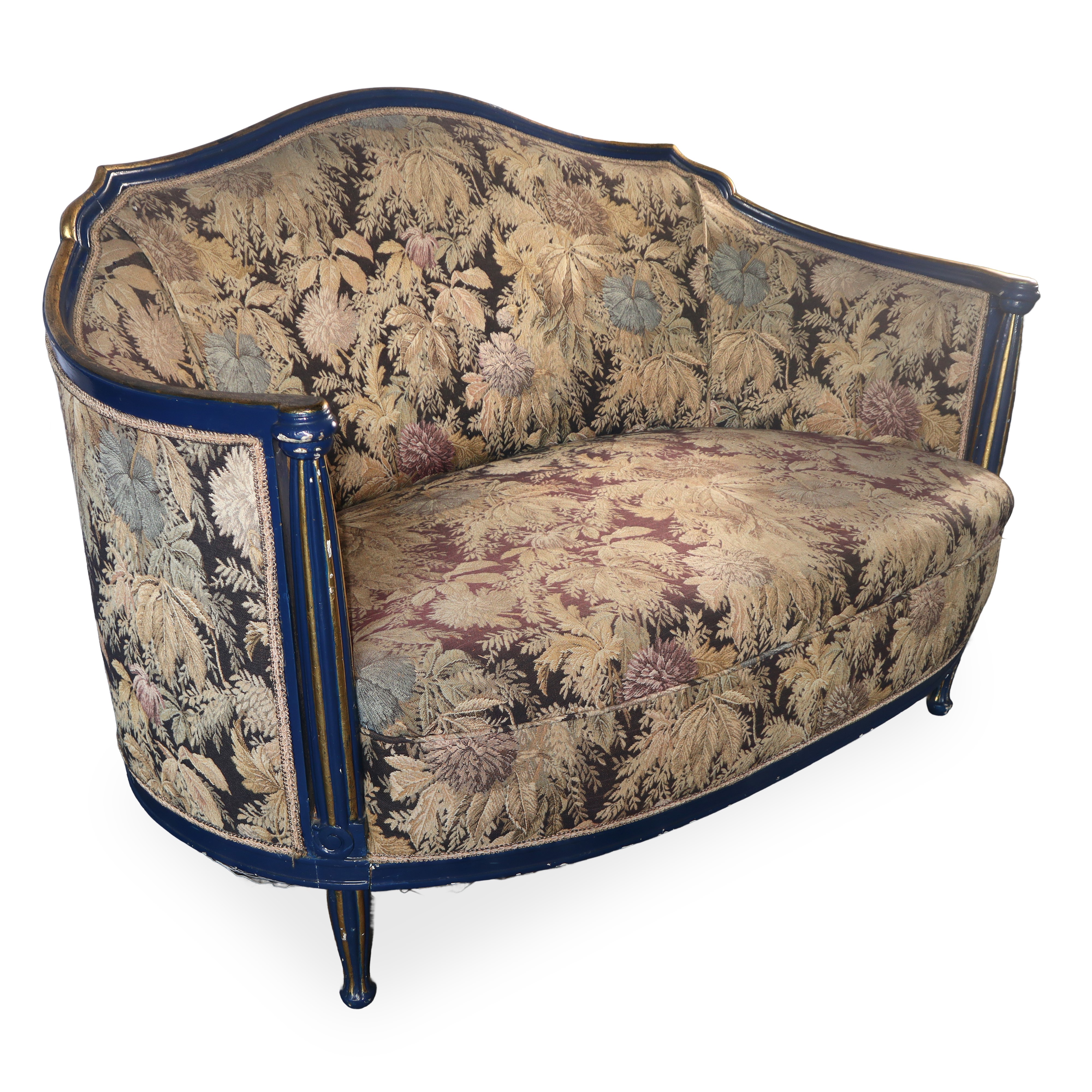 Blue and gold lacquered living room comprising: sofa, 2 armchairs, 4 chairs, 2 coffee tables, 2 poufs and a corner piece, first half of the 20th century