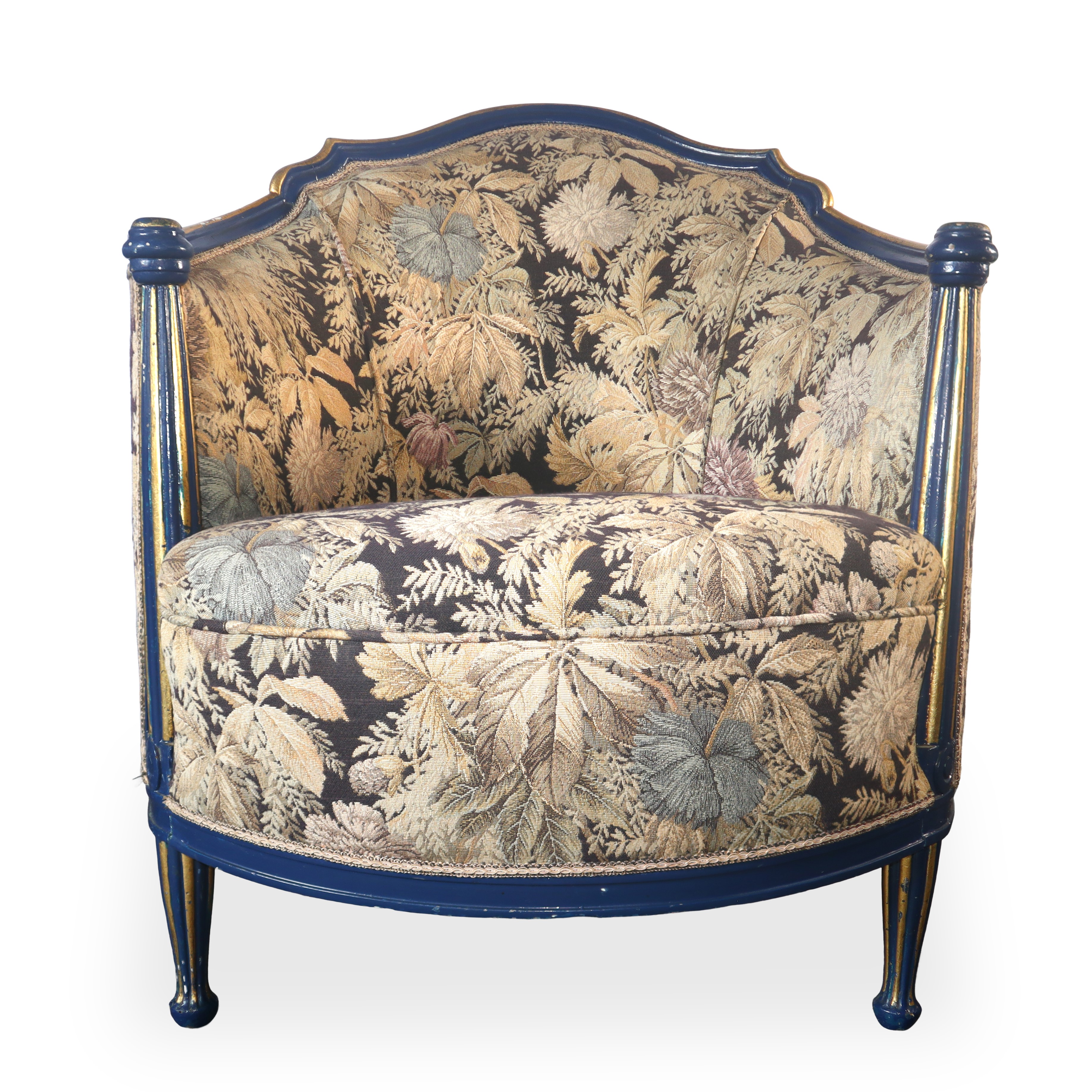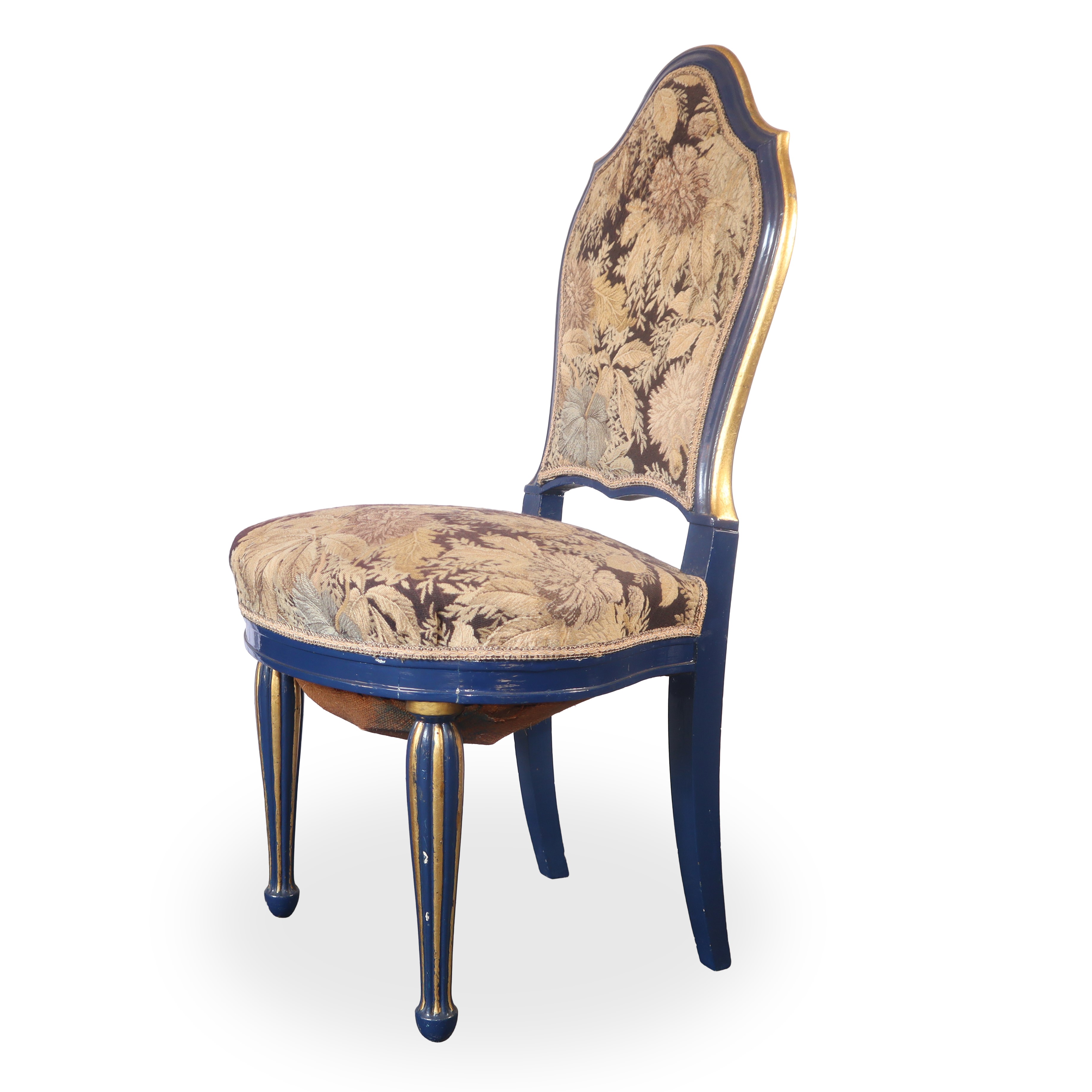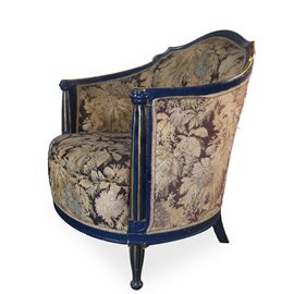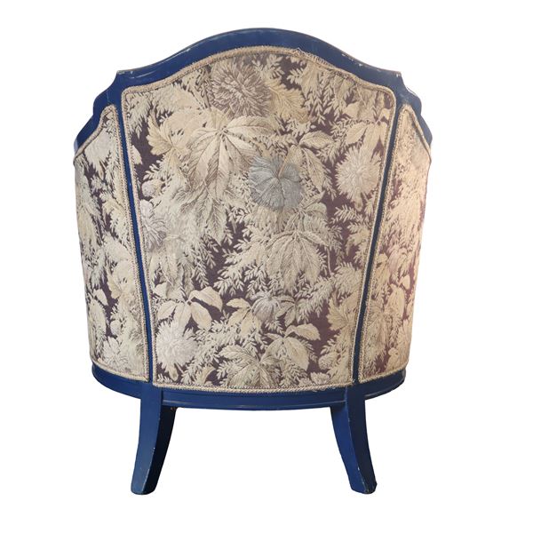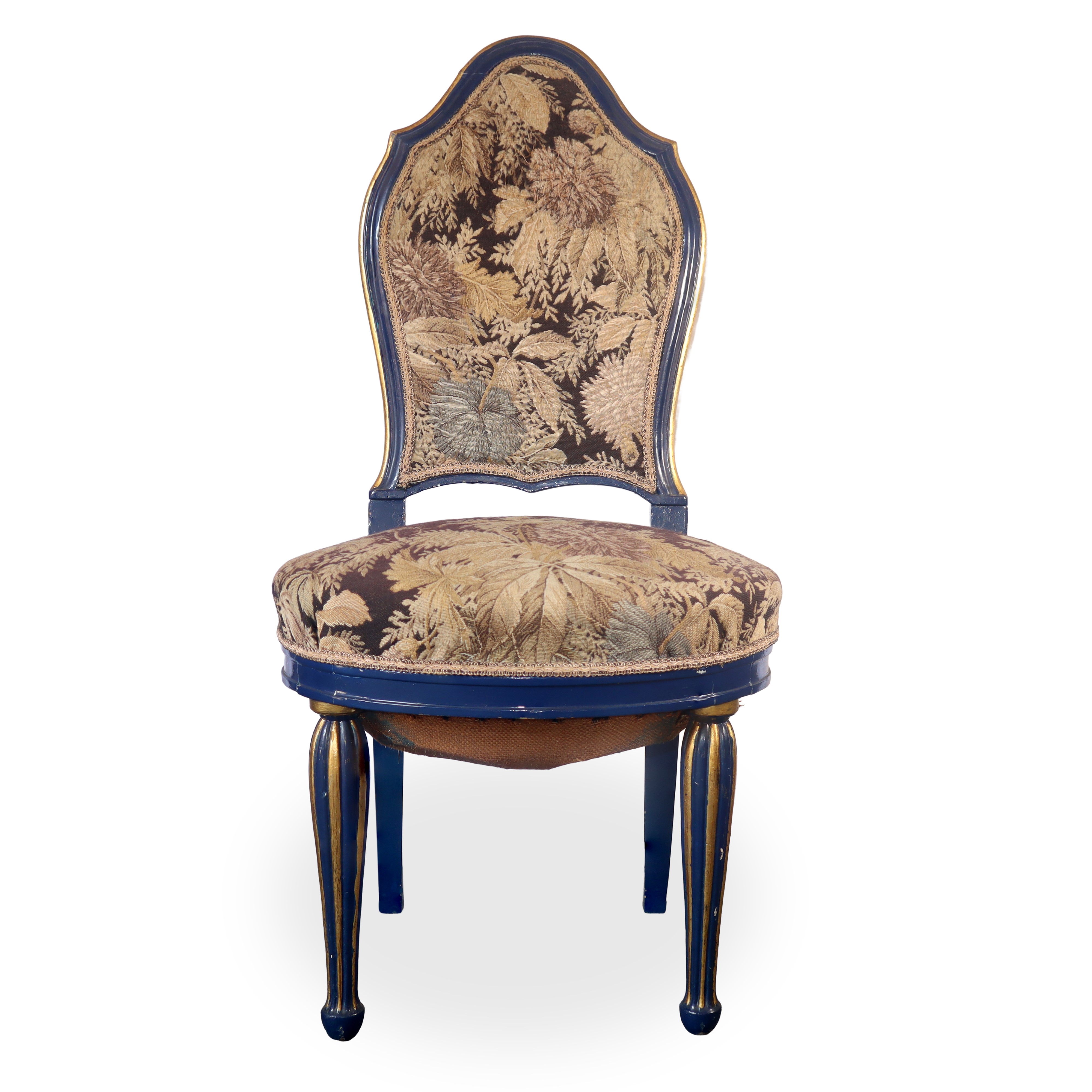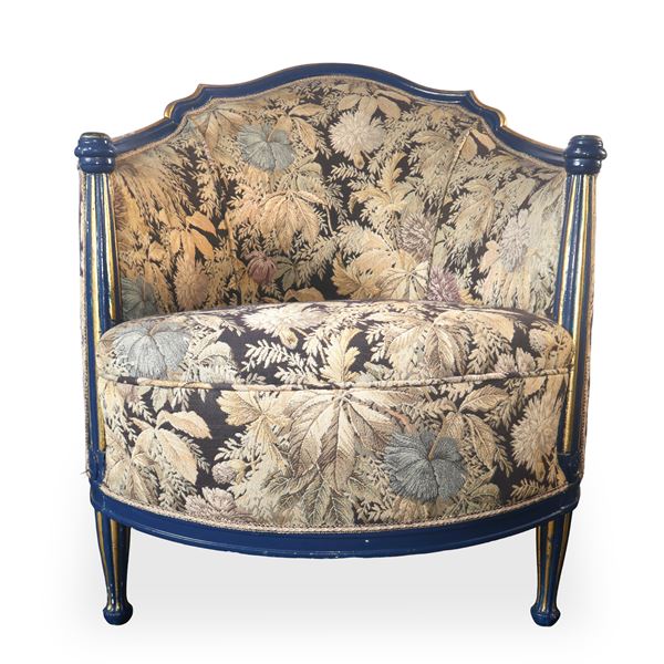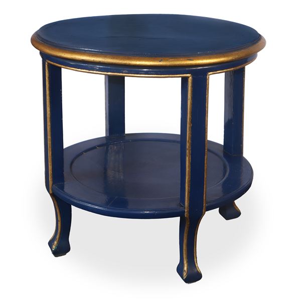 Blue and gold lacquered living room comprising: sofa, 2 armchairs, 4 chairs, 2 coffee tables, 2 poufs and a corner piece, first half of the 20th century
